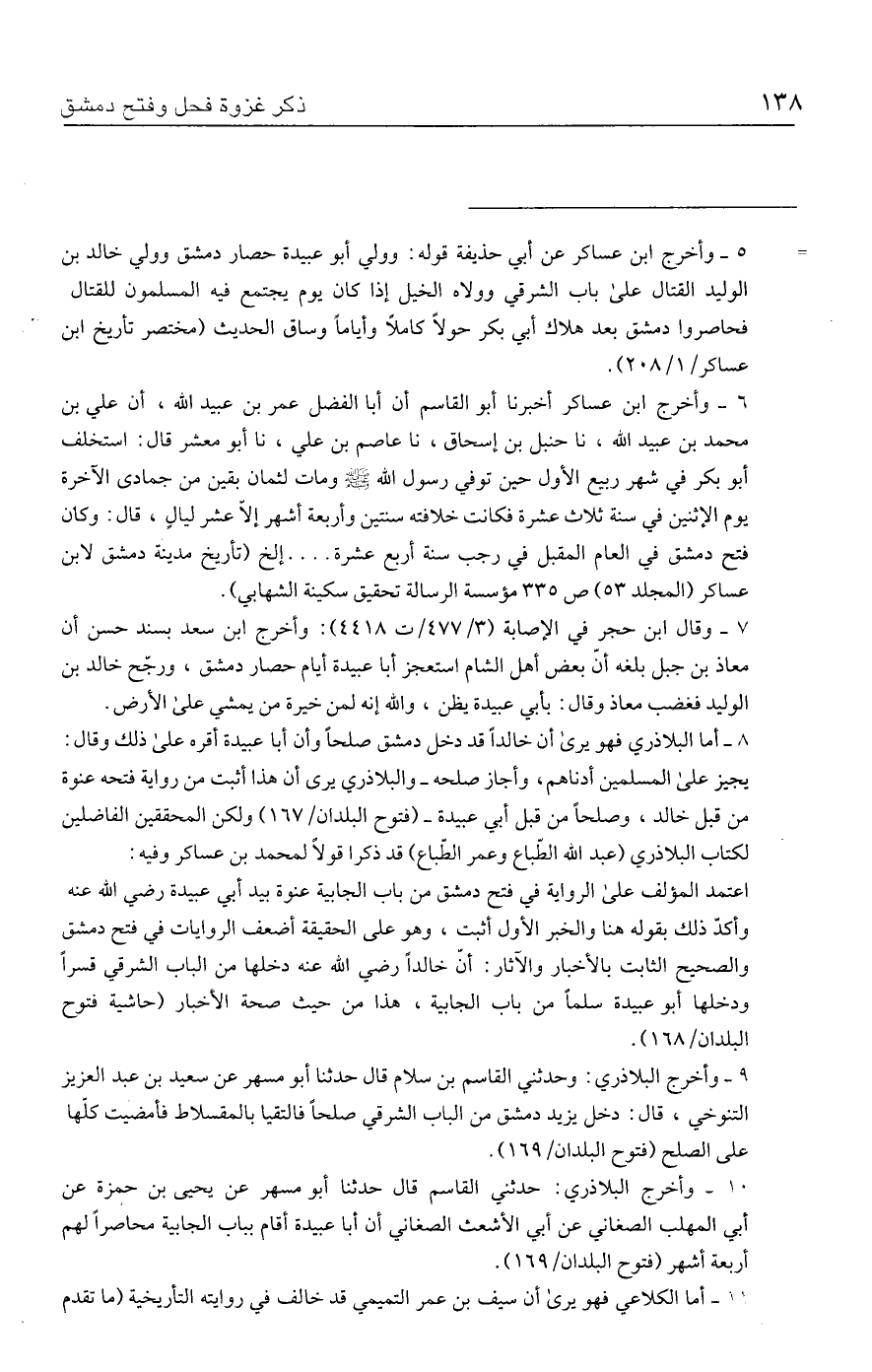 اعتمد المؤلف على الرواية في فتح دمشق من باب الجابية عنوة بيد أبي عبيدة رضي الله عنه وأكدّ ذلك بقوله هنا والخبر الأول أثبت، وهو على الحقيقة أضعف الروايات في فتح دمشق والصحيح الثابت بالأخبار والآثار: أنّ خالدًا رضي الله عنه دخلها من الباب الشرقي قسرًا ودخلها أبو عبيدة سلمًا من باب الجابية، هذا من حيث صحة الأخبار (حاشية فتوح البلدان / ١٦٨).