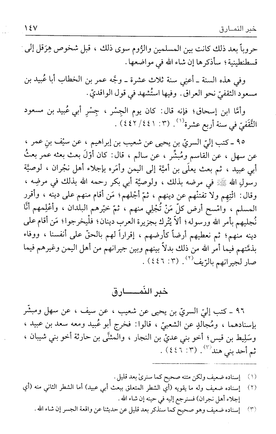 ٩٦ - كتب إليّ السريّ بن يحيى عن شعيب، عن سيف، عن سهل ومبشّر بإسنادهما، ومُجالدٍ عن الشعبيّ، قالوا: فخرج أبو عُبيد ومعه سعد بن عبيد، وسَلِيط بن قيس؛ أخو بني عديّ بن النجار، والمثنَّى بن حارثة أخو بني شيبان، ثم أحد بني هند (٣). (٣: ٤٤٦).