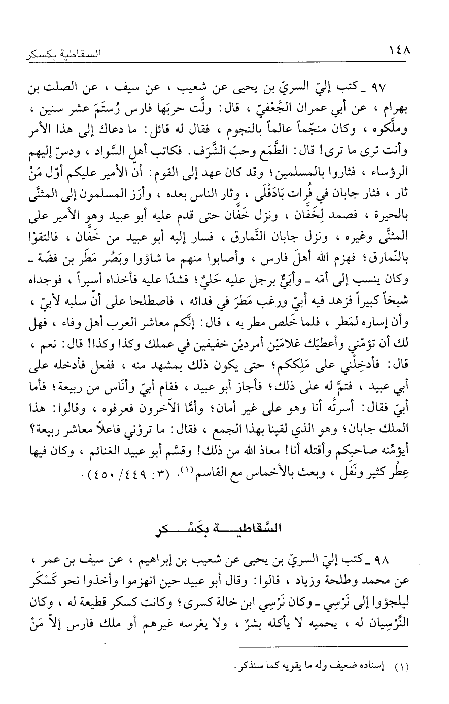 ٩٧ - كتب إليّ السريّ بن يحيى عن شعيب، عن سيف، عن الصلت بن بهرام، عن أبي عمران الجُعْفيّ، قال: ولَّت حربَها فارس رُستَمَ عشر سنين، وملَّكوه، وكان منجّمًا عالمًا بالنجوم، فقال له قائل: ما دعاك إلى هذا الأمر وأنت ترى ما ترى! قال: الطَّمَع وحبّ الشَّرَف. فكاتب أهل السَّواد، ودسّ إليهم الرؤساء، فثاروا بالمسلمين؛ وقد كان عهد إلى القوم: أنّ الأمير عليكم أوّل مَنْ ثار، فثار جابان في فُرات بَادَقْلَى، وثار الناس بعده، وأرَز المسلمون إلى المثنَّى بالحيرة، فصمد لِخَفَّان، ونزل خَفَّان حتى قدم عليه أبو عبيد وهو الأمير على المثنَّى وغيره، ونزل جابان النَّمارق، فسار إليه أبو عبيد من خَفَّان، فالتقوْا بالنّمارق؛ فهزم الله أهلَ فارس، وأصابوا منهم ما شاؤوا وبَصُر مَطَر بن فضّة -وكان ينسب إلى أمّه- وأبَيٌّ برجل عليه حَليٌ؛ فشدّا عليه فأخذاه أسيرًا، فوجداه شيخًا كبيرًا فزهد فيه أبيّ ورغب مَطرَ في فدائه، فاصطلحا على أنّ سلبه لأبيّ، وأن إساره لمَطر، فلما خَلص مطر به، قال: إنَّكم معاشر العرب أهل وفاء، فهل لك أن تؤمّني وأعطيَك غلامَين أمردين خفيفين في عملك وكذا وكذا! قال: نعم، قال: فأدخِلْني على مَلِككم؛ حتى يكون ذلك بمشهد منه، ففعل فأدخله على أبي عبيد، فتمَّ له على ذلك؛ فأجاز أبو عبيد، فقام أبيّ وأنَاس من ربيعة؛ فأما أبيّ فقال: أسرتُه أنا وهو على غير أمان؛ وأمَّا الآخرون فعرفوه، وقالوا: هذا الملك جابان؛ وهو الذي لقينا بهذا الجمع، فقال: ما تروْني فاعلًا معاشر ربيعة؟ أيؤمِّنه صاحبكم وأقتله أنا! معاذ الله من ذلك! وقسَّم أبو عبيد الغنائم، وكان فيها عِطْر كثير ونَفَل، وبعث بالأخماس مع القاسم (١). (٣: ٤٤٩/ ٤٥٠).