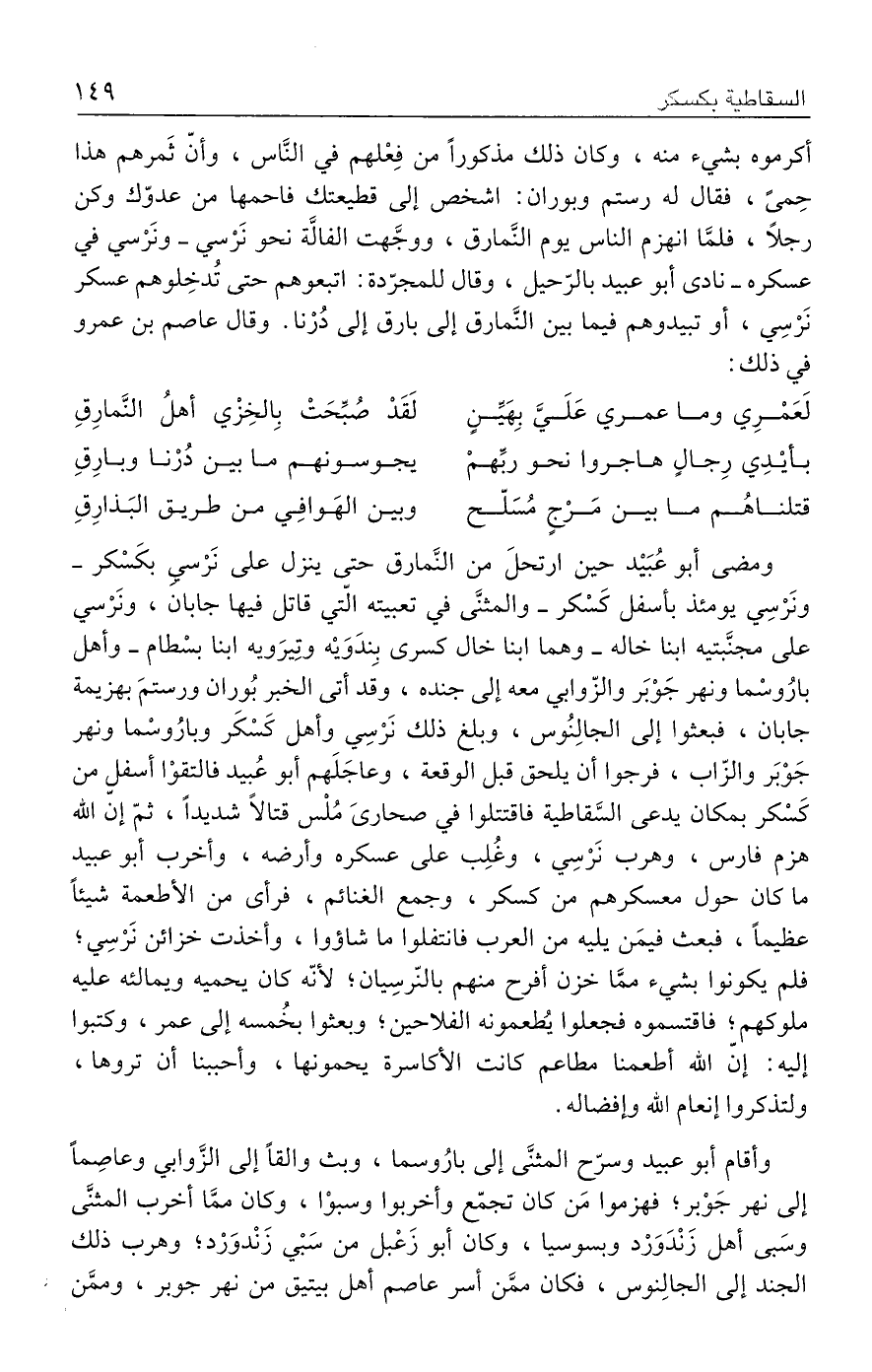 أكرموه بشيء منه، وكان ذلك مذكورًا من فِعْلهم في النَّاس، وأنّ ثَمرهم هذا حِمىً، فقال له رستم وبوران: اشخص إلى قطيعتك فاحمها من عدوّك وكن رجلًا، فلمَّا انهزم الناس يوم النَّمارق، ووجَّهت الفالَّة نحو نَرْسي -ونَرْسي في عسكره- نادى أبو عبيد بالرّحيل، وقال للمجرّدة: اتبعوهم حتى تُدخِلوهم عسكر نَرْسِي، أو تبيدوهم فيما بين النَّمارق إلى بارق إلى دُرْنا. وقال عاصم بن عمرو في ذلك: