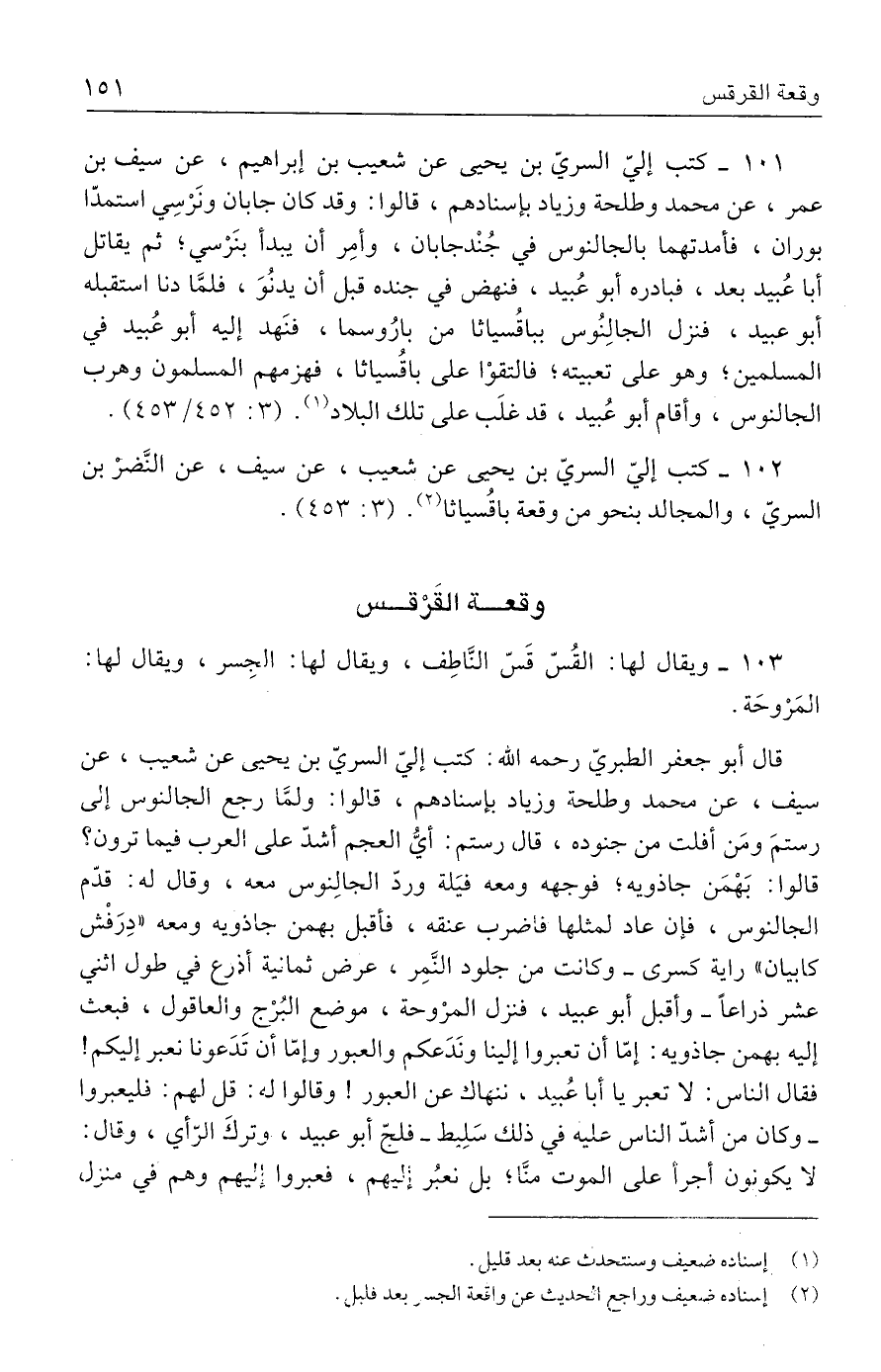 ١٠٢ - كتب إليّ السريّ بن يحيى عن شعيب، عن سيف، عن النَّضرْ بن السريّ، والمجالد بنحو من وقعة باقُسياثا (٢). (٣: ٤٥٣).