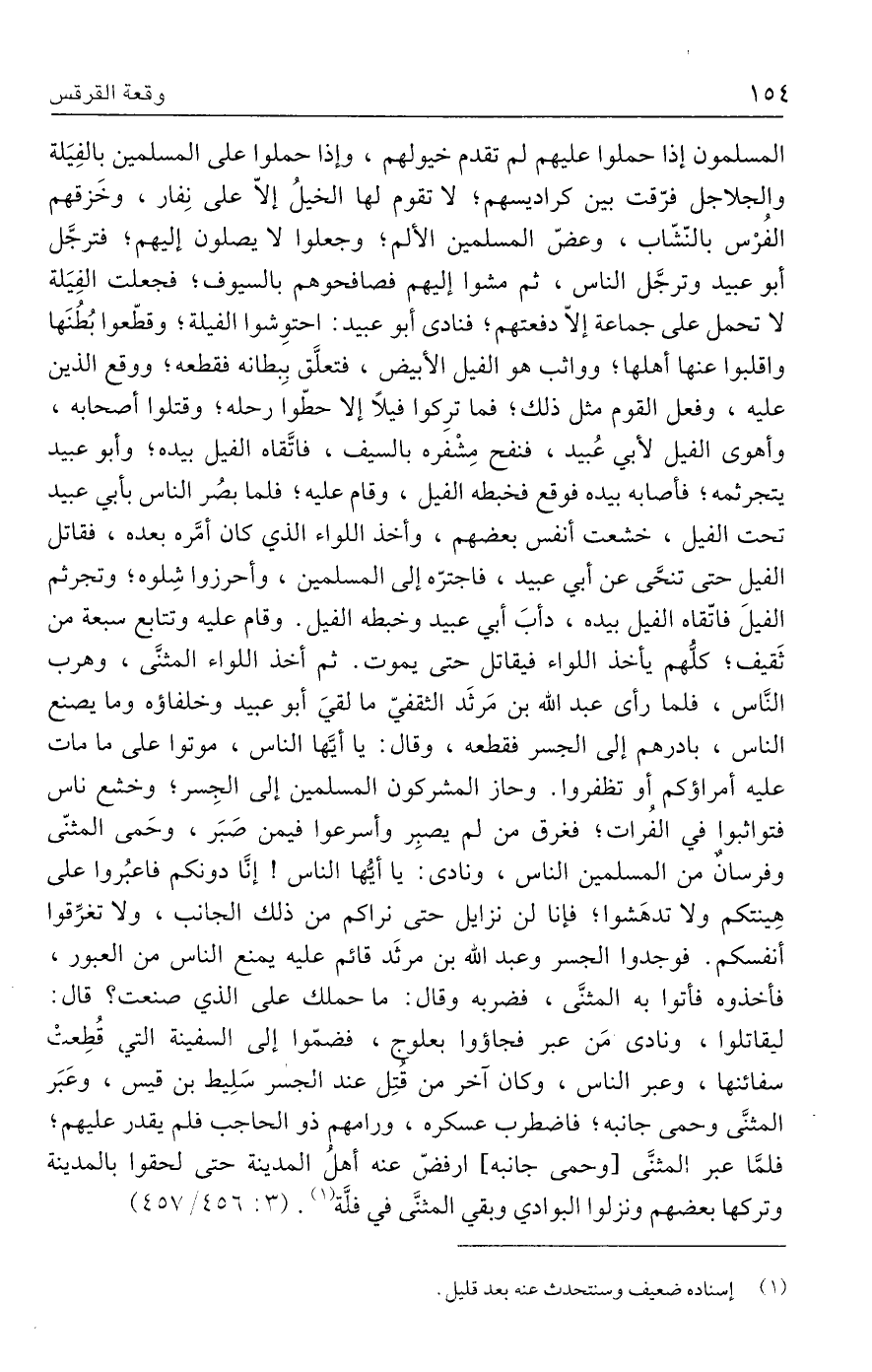 المسلمون إذا حملوا عليهم لم تقدم خيولهم، وإذا حملوا على المسلمين بالفِيَلة والجلاجل فرّقت بين كراديسهم، لا تقوم لها الخيلُ إلّا على نِفار، وخَزقهم الفُرْس بالنّشّاب، وعضّ المسلمين الألم؛ وجعلوا لا يصلون إليهم، فترجَّل أبو عبيد وترجَّل الناس، ثم مشوا إليهم فصافحوهم بالسيوف؛ فجعلت الفِيَلة لا تحمل على جماعة إلّا دفعتهم، فنادى أبو عبيد: احتوشوا الفيلة، وقطّعوا بُطُنَها واقلبوا عنها أهلها؛ وواثب هو الفيل الأبيض، فتعلَّق بِبطانه فقطعه؛ ووقع الذين عليه، وفعل القوم مثل ذلك؛ فما تركوا فيلًا إلا حطّوا رحله؛ وقتلوا أصحابه، وأهوى الفيل لأبي عُبيد، فنفح مِشْفره بالسيف، فاتَّقاه الفيل بيده؛ وأبو عبيد يتجرثمه؛ فأصابه بيده فوقع فخبطه الفيل، وقام عليه، فلما بصُر الناس بأبي عبيد تحت الفيل، خشعت أنفس بعضهم، وأخذ اللواء الذي كان أمَّره بعده، فقاتل الفيل حتى تنحَّى عن أبي عبيد، فاجترّه إلى المسلمين، وأحرزوا شِلوه؛ وتجرثم الفيلَ فاتّقاه الفيل بيده، دأبَ أبي عبيد وخبطه الفيل. وقام عليه وتتابع سبعة من ثَقيف، كلُّهم يأخذ اللواء فيقاتل حتى يموت. ثم أخذ اللواء المثنَّى، وهرب النَّاس، فلما رأى عبد الله بن مَرثَد الثقفيّ ما لقيَ أبو عبيد وخلفاؤه وما يصنع الناس، بادرهم إلى الجسر فقطعه، وقال: يا أيَّها الناس، موتوا على ما مات عليه أمراؤكم أو تظفروا. وحاز المشركون المسلمين إلى الجِسر، وخشع ناس فتواثبوا في الفُرات؛ فغرق من لم يصبِر وأسرعوا فيمن صبَر، وحَمى المثنّى وفرسانٌ من المسلمين الناس، ونادى: يا أيُّها الناس! إنَّا دونكم فاعبُروا على هِينتكم ولا تدهَشوا؛ فإنا لن نزايل حتى نراكم من ذلك الجانب، ولا تغرِّقوا أنفسكم. فوجدوا الجسر وعبد الله بن مرثَد قائم عليه يمنع الناس من العبور، فأخذوه فأتوا به المثنَّى، فضربه وقال: ما حملك على الذي صنعت؟ قال: ليقاتلوا، ونادى مَن عبر فجاؤوا بعلوج، فضمّوا إلى السفينة التي قُطِعتْ سفائنها، وعبر الناس، وكان آخر من قتِل عند الجسر سَلِيط بن قيس، وعَبَر المثنَّى وحمى جانبه، فاضطرب عسكره، ورامهم ذو الحاجب فلم يقدر عليهم؛ فلمَّا عبر المثنَّى [وحمى جانبه] ارفضّ، عنه أهلُ المدينة حتى لحقوا بالمدينة وتركها بعضهم ونزلوا البوادي وبقي المثنَّى في فلَّة (١). (٣: ٤٥٦/ ٤٥٧).