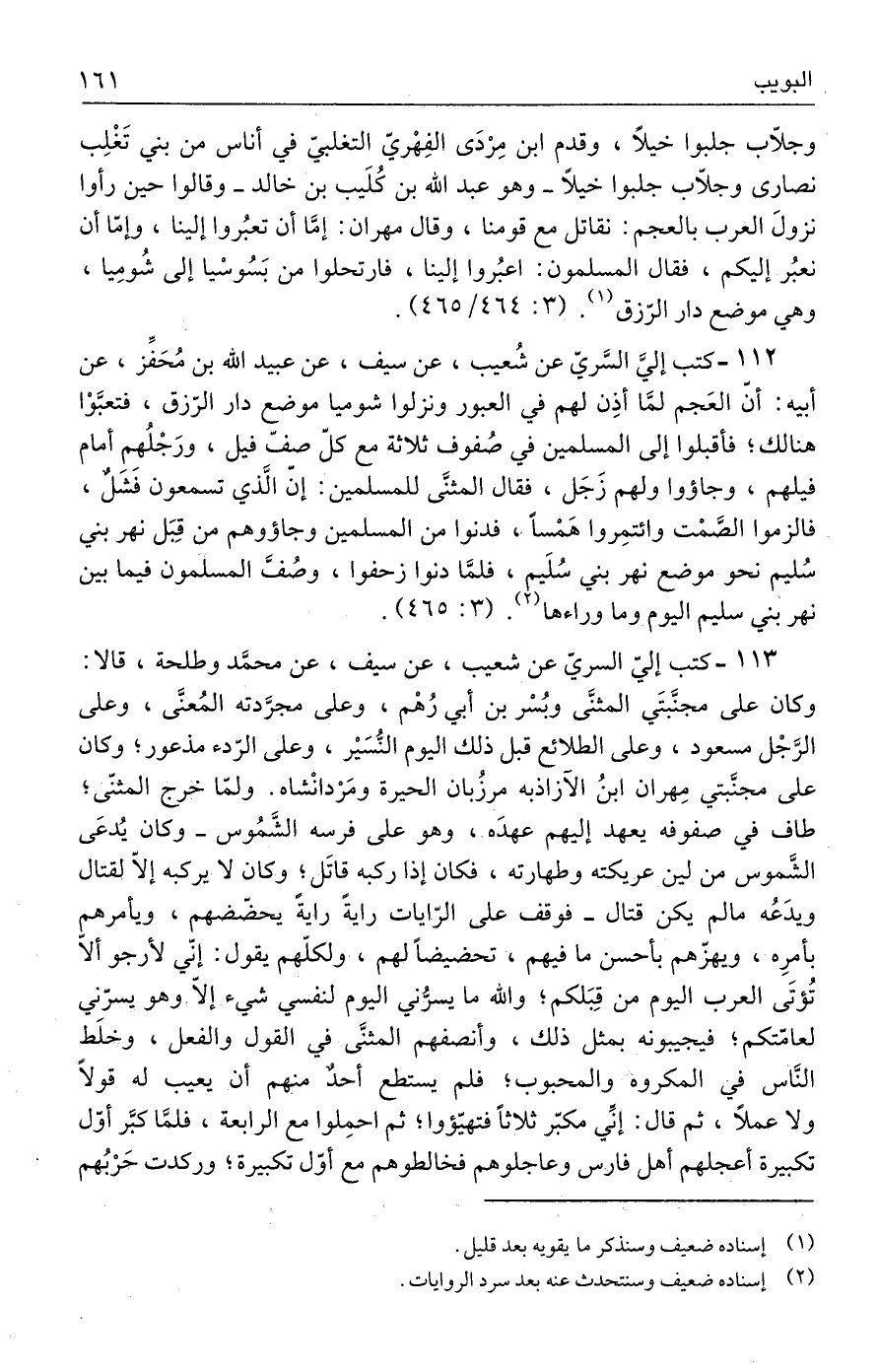 ١١٢ - كتب إليَّ السَّريّ عن شُعيب، عن سيف، عن عبيد الله بن مُحَفِّز، عن أبيه: أنّ العَجم لمَّا أذِن لهم في العبور ونزلوا شوميا موضع دار الرّزق، فتعبَّوْا هنالك؛ فأقبلوا إلى المسلمين في صُفوف ثلاثة مع كلّ صفّ فيل، ورَجْلُهم أمام فيلهم، وجاؤوا ولهم زَجَل، فقال المثنَّى للمسلمين: إنّ الَّذي تسمعون فَشَل، فالزموا الصَّمْت وائتمِروا هَمْسًا، فدنوا من المسلمين وجاؤوهم من قِبَل نهر بني سُليم نحو موضع نهر بني سُلَيم، فلمَّا دنوا زحفوا، وصُفَّ المسلمون فيما بين نهر بني سليم إليوم وما وراءها (٢). (٣: ٤٦٥).