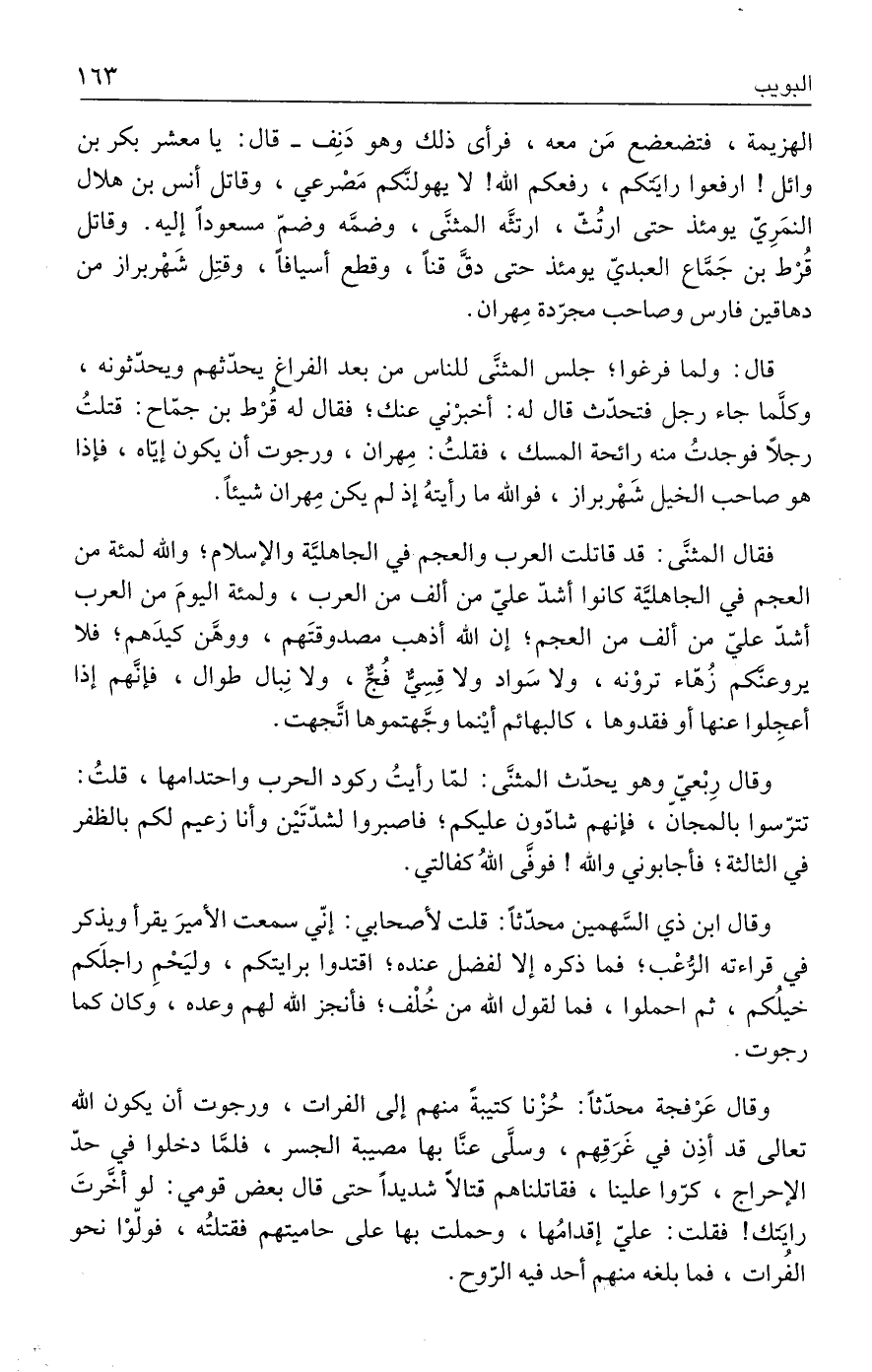 فقال المثنَّى: قد قاتلت العرب والعجم في الجاهليَّة والإسلام؛ والله لمئة من العجم في الجاهليَّة كانوا أشدّ عليّ من ألف من العرب، ولمئة اليومَ من العرب أشدّ عليّ من ألف من العجم؛ إن الله أذهب مصدوقتَهم، ووهَّن كيدَهم؛ فلا يروعنَّكم زُهّاء تروْنه، ولا سَواد ولا قِسِيٌّ فُجٌّ، ولا نِبال طوال، فإنَّهم إذا أعجِلوا عنها أو فقدوها، كالبهائم أينما وجَّهتموها اتَّجهت.