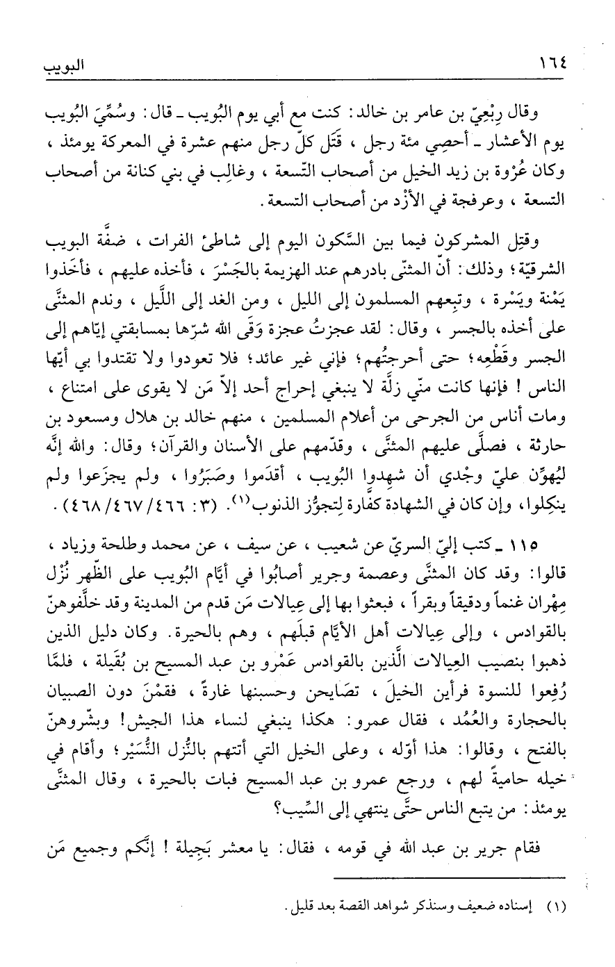 ١١٥ - كتب إليّ السريّ عن شعيب، عن سيف، عن محمد وطلحة وزياد، قالوا: وقد كان المثنَّى وعصمة وجرير أصابُوا في أيَّام البُويب على الظّهر نُزْل مِهْران غنمًا ودقيقًا وبقرًا، فبعثوا بها إلى عِيالات مَن قدم من المدينة وقد خلَّفوهنّ بالقوادس، وإلى عِيالات أهل الأيَّام قبلَهم، وهم بالحيرة. وكان دليل الذين ذهبوا بنصيب العِيالات الَّذين بالقوادس عَمْرو بن عبد المسيح بن بُقَيلة، فلمَّا رُفِعوا للنسوة فرأين الخيلَ، تصَايحن وحسبنها غارةً، فقمْنَ دون الصبيان بالحجارة والعُمُد، فقال عمرو: هكذا ينبغي لنساء هذا الجيش! وبشّروهنّ بالفتح، وقالوا: هذا أوّله، وعلى الخيل التي أتتهم بالنُّزل النُّسَير؛ وأقام في خيله حاميةً لهم، ورجع عمرو بن عبد المسيح فبات بالحيرة، وقال المثنَّى يومئذ: من يتبع الناس حتَّى ينتهي إلى السِّيب؟