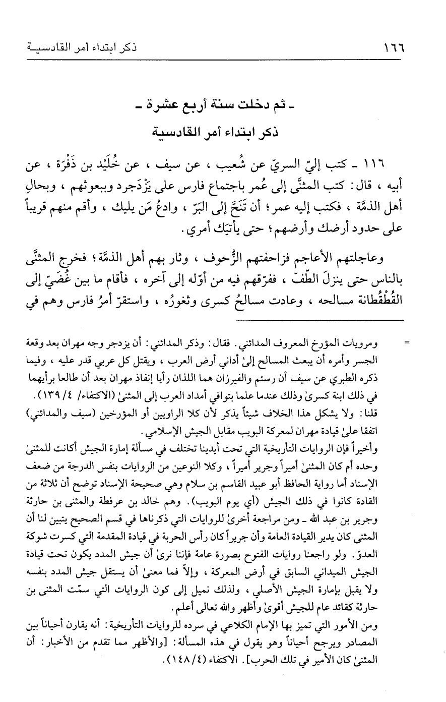 ١١٦ - كتب إليّ السريّ عن شُعيب، عن سيف، عن خُلَيد بن ذَفْرَة، عن أبيه، قال: كتب المثنَّى إلى عُمر باجتماع فارس على يَزْدَجرد وببعوثهم، وبحالِ أهل الذمَّة، فكتب إليه عمر؛ أن تَنَحَّ إلى البَرّ، وادعُ مَن يليك، وأقم منهم قريبًا على حدود أرضك وأرضهم؛ حتى يأتيَك أمري.