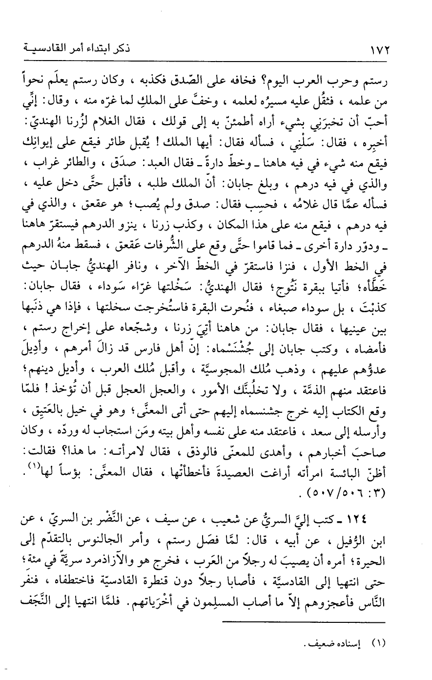 ١٢٤ - كتب إليَّ السريُّ عن شعيب، عن سيف، عن النَّضْر بن السريّ، عن ابن الرُّفيل، عن أبيه، قال: لمَّا فصَل رستم، وأمر الجالنوس بالتقدّم إلى الحيرة؛ أمره أن يصيبَ له رجلًا من العَرب، فخرج هو والآزاذمرد سريَّةً في مئة؛ حتى انتهيا إلى القادسيَّة، فأصابا رجلًا دون قنطرة القادسيّة فاختطفاه، فنفر النَّاس فأعجزوهم إلّا ما أصاب المسلِمون في أخْرَياتهم. فلمَّا انتهيا إلى النَّجَف