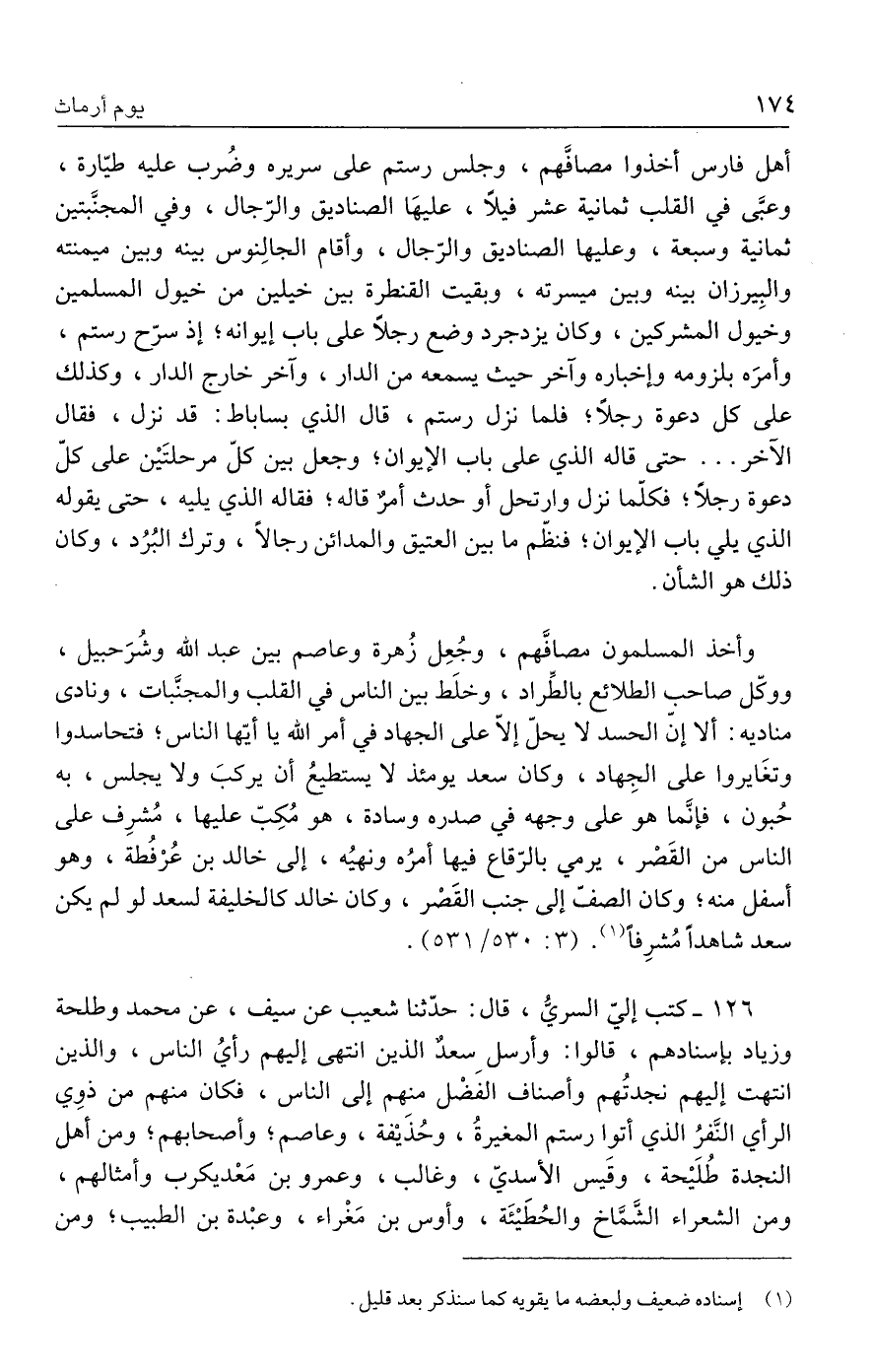 ١٢٦ - كتب إليّ السريُّ، قال: حدَّثنا شعيب عن سيف، عن محمد وطلحة وزياد بإسنادهم، قالوا: وأرسل سعدٌ الذين انتهى إليهم رأيُ الناس، والذين انتهت إليهم نجدتُهم وأصناف الفَضْل منهم إلى الناس، فكان منهم من ذوي الرأي النَّفرُ الذي أتوا رستم المغيرةُ، وحُذَيفة، وعاصم؛ وأصحابهم؛ ومن أهل النجدة طُلَيْحة، وقَيس الأسديّ، وغالب، وعمرو بن مَعْديكرب وأمثالهم، ومن الشعراء الشَّمَّاخ والحُطَيئَة، وأوس بن مَغْواء، وعبْدة بن الطبيب؛ ومن