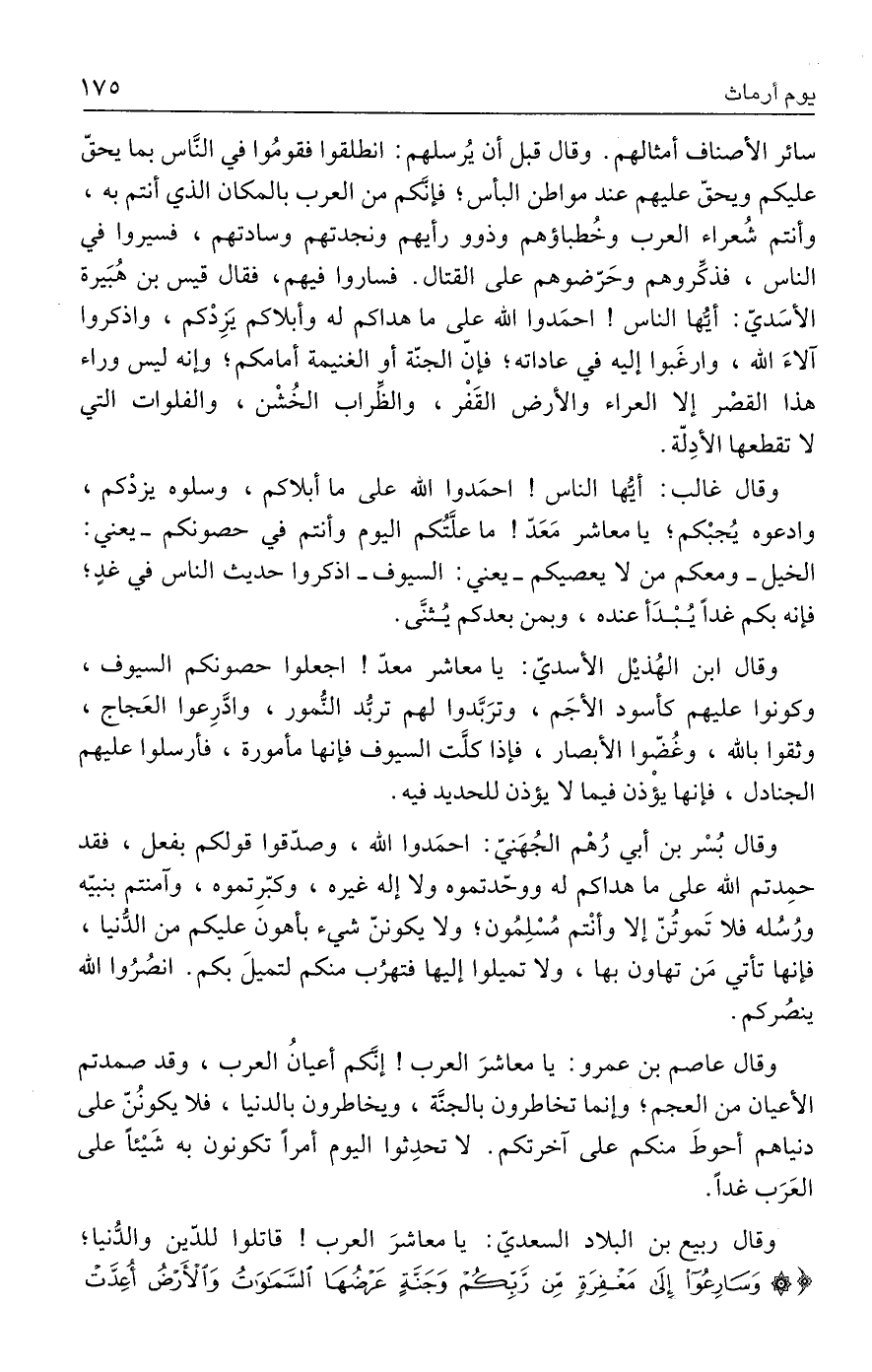 سائر الأصناف أمثالهم. وقال قبل أن يُرسلهم: انطلقوا فقومُوا في النَّاس بما يحقّ عليكم ويحقّ عليهم عند مواطن البأس؛ فإنَّكم من العرب بالمكان الذي أنتم به، وأنتم شُعراء العرب وخُطباؤهم وذوو رأيهم ونجدتهم وسادتهم، فسيروا في الناس، فذكِّروهم وحَرّضوهم على القتال. فساروا فيهم، فقال قيس بن هُبَيرة الأسَديّ: أيُّها الناس! احمَدوا الله على ما هداكم له وأبلاكم يَزِدْكم، واذكروا آلاءَ الله، وارغَبوا إليه في عاداته؛ فإنّ الجنّة أو الغنيمة أمامكم؛ وإنه ليس وراء هذا القصْر إلا العراء والأرض القَفْر، والطراب الخُشْن، والفلوات التي لا تقطعها الأدِلّة.