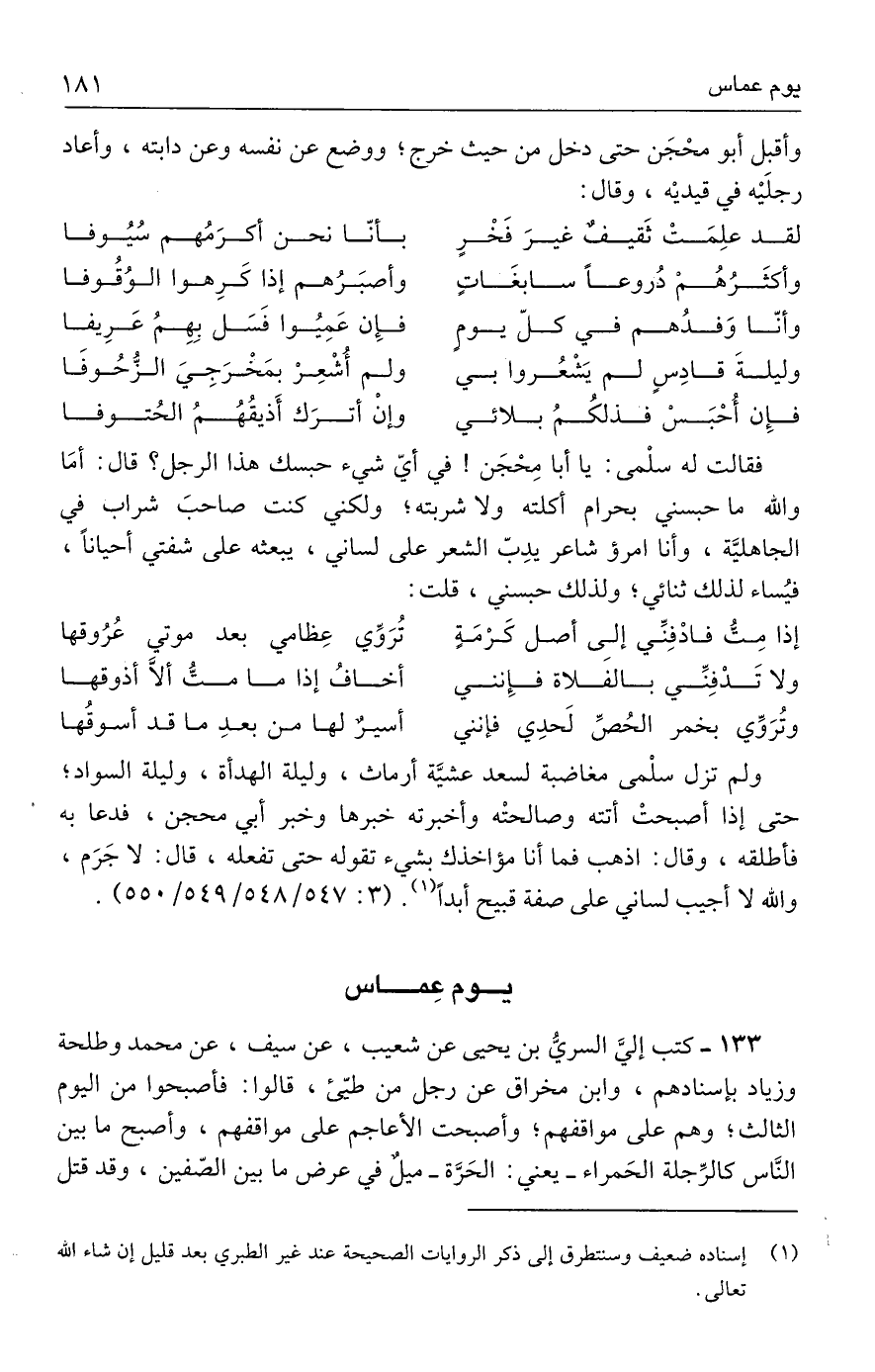 ولم تزل سلْمى مغاضبة لسعد عشيَّة أرماث، وليلة الهدأة، وليلة السواد؛ حتى إذا أصبحتْ أتته وصالحتْه وأخبرته خبرها وخبر أبي محجن، فدعا به فأطلقه، وقال: اذهب فما أنا مؤاخذك بشيء تقوله حتى تفعله، قال: لا جَرَم، والله لا أجيب لساني على صفة قبيح أبدًا (١). (٣: ٥٤٧/ ٥٤٨ / ٥٤٩/ ٥٥٠).