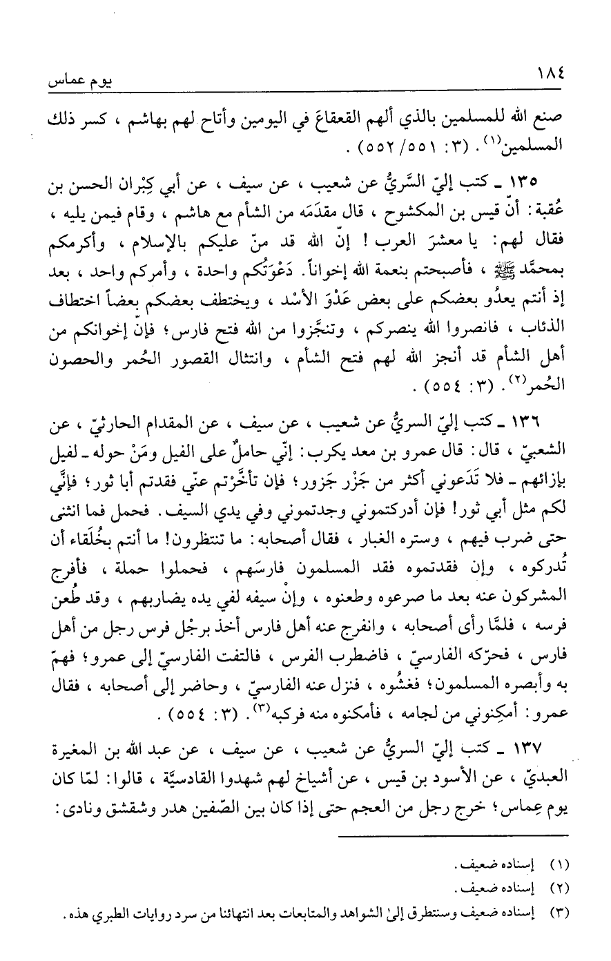 ١٣٥ - كتب إليّ السَّريُّ عن شعيب، عن سيف، عن أبي كِبْران الحسن بن عُقبة: أنّ قيس بن المكشوح، قال مقدَمَه من الشأم مع هاشم، وقام فيمن يليه، فقال لهم: يا معشرَ العرب! إنّ الله قد منّ عليكم بالإسلام، وأكرمكم بمحمَّد - صلى الله عليه وسلم -، فأصبحتم بنعمة الله إخوانًا. دَعْوَتُكم واحدة، وأمركم واحد، بعد إذ أنتم يعدُو بعضكم على بعض عَدْوَ الأسْد، ويختطف بعضكم بعضًا اختطاف الذئاب، فانصروا الله ينصركم، وتنجَّزوا من الله فتح فارس؛ فإنّ إخوانكم من أهل الشأم قد أنجز الله لهم فتح الشام، وانتثال القصور الحُمر والحصون الحُمر (٢). (٣: ٥٥٤).