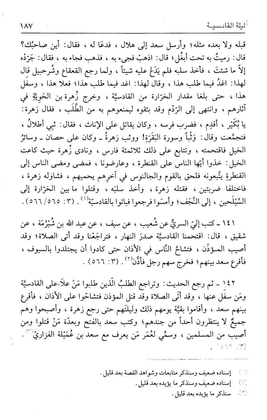 ١٤٢ - ثم رجع الحديث: وتراجع الطلبُ الّذين طلبوا مَنْ علا على القادسيَّة ومَن سفَل عنها، وقد أتَى الصلاة وقد قتل المؤذن فتشاحّوا على الأذان، فأقرع بينهم سعد، وأقاموا بقيَّة يومهم ذلك وليلتَهم حتى رجع زهرة، وأصبحوا وهم جميعٌ لا ينتظرون أحدًا من جندهم، وكتب سعد بالفتح وبعدّة مَنْ قتلوا ومن أصيب من المسلمين، وسمِّي لعُمَر مَن يعرف مع سعد بن عُمَيلة الفزاريّ (٣). (٣: ٥٦٦).