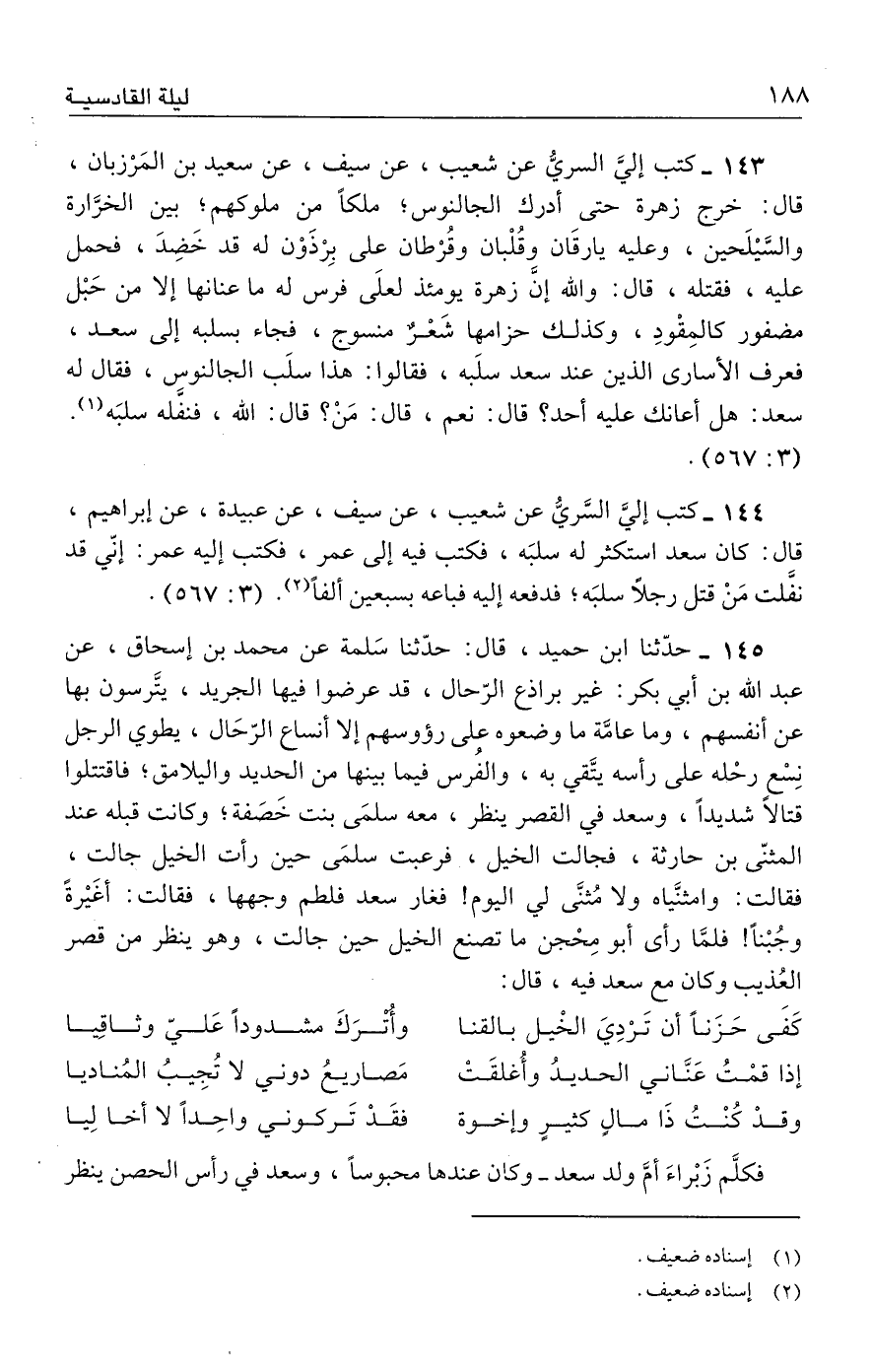١٤٣ - كتب إليَّ السريّ عن شعيب، عن سيف، عن سعيد بن المَرْزبان، قال: خرج زهرة حتى أدرك الجالنوس؛ ملكًا من ملوكهم؛ بين الخرَّارة والسَّيلَحين، وعليه يارقَان وقُلْبان وقُرْطان على بِرْذَوْن له قد خَضِدَ، فحمل عليه، فقتله، قال: والله إنَّ زهرة يومئذ لعلَى فرس له ما عنانها إلا من حَبْل مضفور كالمِقْودِ، وكذلك حزامها شَعْرٌ منسوج، فجاء بسلبه إلى سعد، فعرف الأسارى الذين عند سعد سلَبه، فقالوا: هذا سلَب الجالنوس، فقال له سعد: هل أعانك عليه أحد؟ قال: نعم، قال: مَنْ؟ قال: الله، فنفَّله سلبَه (١). (٣: ٥٦٧).