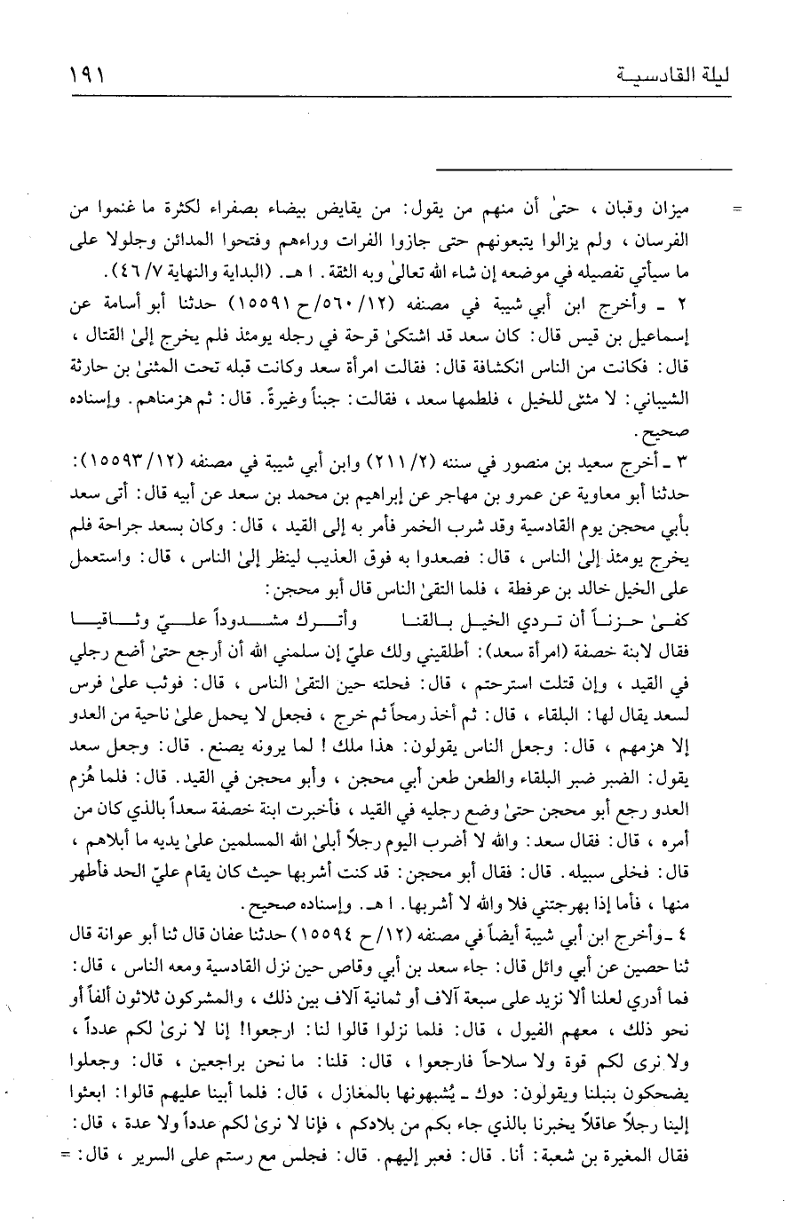 ٤ - وأخرج ابن أبي شيبة أيضًا في مصنفه (١٢ / ح ١٥٥٩٤) حدثنا عفان قال ثنا أبو عوانة قال ثنا حصين عن أبي وائل قال: جاء سعد بن أبي وقاص حين نزل القادسية ومعه الناس، قال: فما أدري لعلنا ألا نزيد على سبعة آلاف أو ثمانية آلاف بين ذلك، والمشركون ثلاثون ألفًا أو نحو ذلك، معهم الفيول، قال: فلما نزلوا قالوا لنا: ارجعوا! إنا لا نرى لكم عددًا، ولا نرى لكم قوة ولا سلاحًا فارجعوا، قال: قلنا: ما نحن براجعين، قال: وجعلوا يضحكون بنبلنا ويقولون: دوك - يُشبهونها بالمغازل، قال: فلما أبينا عليهم قالوا: ابعثوا إلينا رجلًا عاقلًا يخبرنا بالذي جاء بكم من بلادكم، فإنا لا نرى لكم عددًا ولا عدة، قال: فقال المغيرة بن شعبة: أنا. قال: فعبر إليهم. قال: فجلس مع رستم على السرير، قال: =
