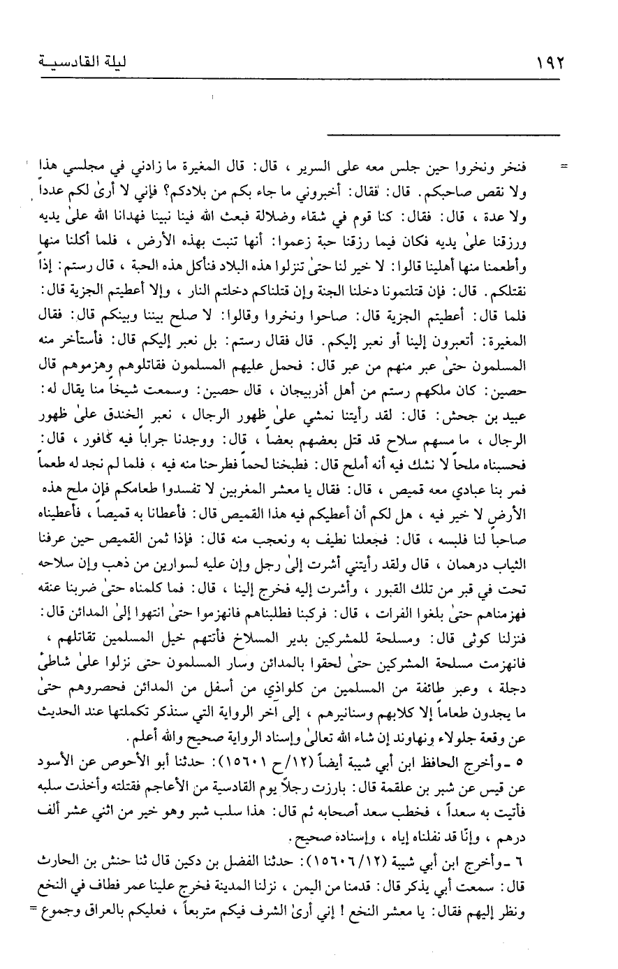 = فنخر ونخروا حين جلس معه على السرير، قال: قال المغيرة ما زادني في مجلسي هذا ولا نقص صاحبكم. قال: فقال: أخبروني ما جاء بكم من بلادكم؟ فإني لا أرى لكم عددًا ولا عدة، قال: فقال: كنا قوم في شقاء وضلالة فبعث الله فينا نبينا فهدانا الله على يديه ورزقنا على يديه فكان فيما رزقنا حبة زعموا: أنها تنبت بهذه الأرض، فلما أكلنا منها وأطعمنا منها أهلينا قالوا: لا خير لنا حتى تنزلوا هذه البلاد فنأكل هذه الحبة، قال رستم: إذًا نقتلكم. قال: فإن قتلتمونا دخلنا الجنة وإن قتلناكم دخلتم النار، وإلا أعطيتم الجزية قال: فلما قال: أعطيتم الجزية قال: صاحوا ونخروا وقالوا: لا صلح بيننا وبينكم قال: فقال المغيرة: أتعبرون إلينا أو نعبر إليكم. قال فقال رستم: بل نعبر إليكم قال: فأستأخر منه المسلمون حتى عبر منهم من عبر قال: فحمل عليهم المسلمون فقاتلوهم وهزموهم قال حصين: كان ملكهم رستم من أهل أذربيجان، قال حصين: وسمعت شيخًا منا يقال له: عبيد بن جحش: قال: لقد رأيتنا نمشي على ظهور الرجال، نعبر الخندق على ظهور الرجال، ما مسهم سلاح قد قتل بعضهم بعضًا، قال: ووجدنا جرابًا فيه كافور، قال: فحسبناه ملحًا لا نشك فيه أنه أملح قال: فطبخنا لحمًا فطرحنا منه فيه، - فلما لم نجد له طعمًا فمر بنا عبادي معه قميص، قال: فقال يا معشر المغربين لا تفسدوا طعامكم فإن ملح هذه الأرض لا خير فيه، هل لكم أن أعطيكم فيه هذا القميص قال: فأعطانا به قميصًا، فأعطيناه صاحبا لنا فلبسه، قال: فجعلنا نطيف به ونعجب منه قال: فإذا ثمن القميص حين عرفنا الثياب درهمان، قال ولقد رأيتني أشرت إلى رجل وإن عليه لسوارين من ذهب وإن سلاحه تحت في قبر من تلك القبور، وأشرت إليه فخرج إلينا، قال: فما كلمناه حتى ضربنا عنقه فهزمناهم حتى بلغوا الفرات، قال: فركبنا فطلبناهم فانهزموا حتى انتهوا إلى المدائن قال: فنزلنا كوثى قال: ومسلحة للمشركين بدير المسلاخ فأتتهم خيل المسلمين تقاتلهم، فانهزمت مسلحة المشركين حتى لحقوا بالمدائن وسار المسلمون حتى نزلوا على شاطئ دجلة، وعبر طائفة من المسلمين من كلواذي من أسفل من المدائن فحصروهم حتى ما يجدون طعامًا إلا كلابهم وسنانيرهم، إلى آخر الرواية التي سنذكر تكملتها عند الحديث عن وقعة جلولاء ونهاوند إن شاء الله تعالى وإسناد الرواية صحيح والله أعلم.