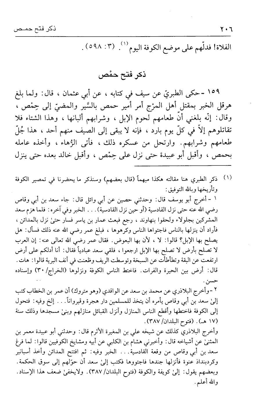 ١٥٩ - حكى الطبريّ عن سيف في كتابه، عن أبي عثمان، قال: ولما بلغ هرقل الخبر بمقتل أهل المرْج أمر أمير حمص بالسَّير والمضيّ إلى حِمْص، وقال: إنّه بلغني أنّ طعامهم لحوم الإبل، وشرابهم ألبانها، وهذا الشتاء فلا تقاتلوهم إلّا في كلّ يوم بارد، فإنه لا يبقى إلى الصيف منهم أحد، هذا جُلّ طعامهم وشرابهم. وارتحل من عسكره ذلك، فأتى الرُّهاء، وأخذه عامله بحمص، وأقبل أبو عبيدة حتى نزل على حِمْص، وأقبل خالد بعده حتى ينزل