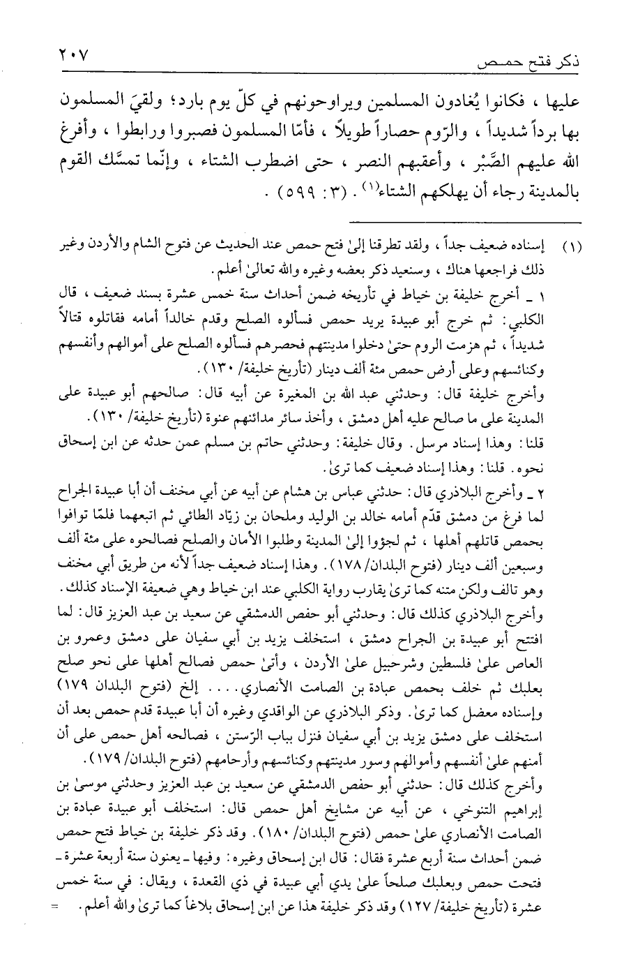 (١) إسناده ضعيف جدًّا، ولقد تطرقنا إلى فتح حمص عند الحديث عن فتوح الشام والأردن وغير ذلك فراجعها هناك، وسنعيد ذكر بعضه وغيره والله تعالى أعلم.