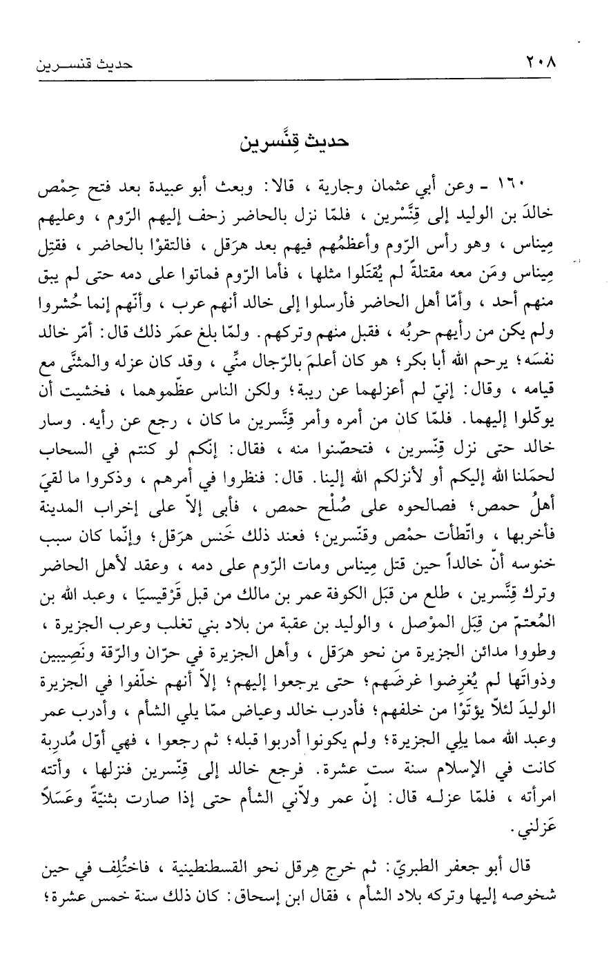 ١٦٠ - وعن أبي عثمان وجارية، قالا: وبعث أبو عبيدة بعد فتح حِمْص خالدَ بن الوليد إلى قِنَّسْرين، فلمّا نزل بالحاضر زحف إليهم الرّوم، وعليهم مِيناس، وهو رأس الرّوم وأعظمُهم فيهم بعد هرَقل، فالتقوْا بالحاضر، فقتِل مِيناس ومَن معه مقتلةً لم يُقتَلوا مثلها، فأما الرّوم فماتوا على دمه حتى لم يبق منهم أحد، وأمّا أهل الحاضر فأرسلوا إلى خالد أنهم عرب، وأنّهم إنما حُشروا ولم يكن من رأيهم حربُه، فقبل منهم وتركهم. ولمّا بلغ عمَر ذلك قال: أمّر خالد نفسَه؛ يرحم الله أبا بكر؛ هو كان أعلمَ بالرّجال منِّي، وقد كان عزله والمثنَّى مع قيامه، وقال: إنّي لم أعزلهما عن ريبة؛ ولكن الناس عظّموهما، فخشيت أن يوكّلوا إليهما. فلمّا كان من أمره وأمر قِنَّسرين ما كان، رجع عن رأيه. وسار خالد حتى نزل قِنّسرين، فتحصّنوا منه، فقال: إنكم لو كنتم في السحاب لحمَلنا الله إليكم أو لأنزلكم الله إلينا. قال: فنظروا في أمرهم، وذكروا ما لقيَ أهلُ حمص؛ فصالحوه على صُلْح حمص، فأبى إلَّا على إخراب المدينة فأخربها، واتّطأت حمْص وقنّسرين؛ فعند ذلك خَنس هرَقل؛ وإنّما كان سبب خنوسه أنّ خالدًا حين قتل مِيناس ومات الرّوم على دمه، وعقد لأهل الحاضر وترك قِنَّسرين، طلع من قبَل الكوفة عمر بن مالك من قبل قَرْقيسيَا، وعبد الله بن المُعتمّ من قِبَل الموْصل، والوليد بن عقبة من بلاد بني تغلب وعرب الجزيرة، وطووا مدائن الجزيرة من نحو هرَقل، وأهل الجزيرة في حرّان والرّقة ونَصِيبين وذواتَها لم يُغرِضوا غرضهم؛ حتى يرجعوا إليهم؛ إلَّا أنهم خلّفوا في الجزيرة الوليدَ لئلّا يؤتَوْا من خلفهم؛ فأدرب خالد وعياض ممّا يلي الشأم، وأدرب عمر وعبد الله مما يلِي الجزيرة؛ ولم يكونوا أدربوا قبله؛ ثم رجعوا، فهي أوّل مُدرِبة كانت في الإسلام سنة ست عشرة. فرجع خالد إلى قِنّسرين فنزلها، وأتته امرأته، فلمّا عزله قال: إنّ عمر ولّاني الشأم حتى إذا صارت بثنيّةً وعَسَلًا عَزلني.