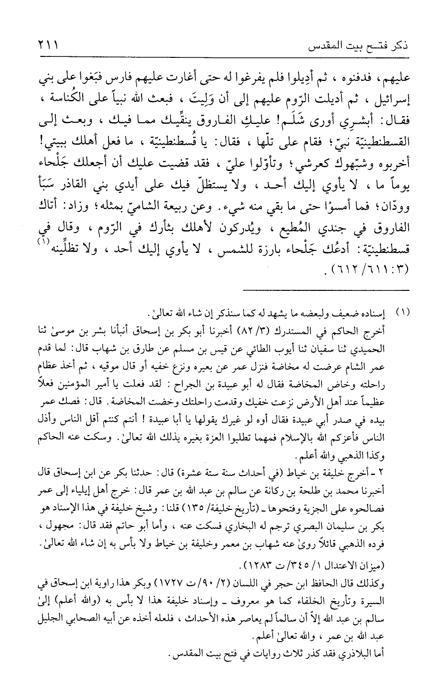 ٢ - أخرج خليفة بن خياط (في أحداث سنة ستة عشرة) قال: حدثنا بكر عن ابن إسحاق قال أخبرنا محمد بن طلحة بن ركانة عن سالم بن عبد الله بن عمر قال: خرج أهل إيلياء إلى عمر فصالحوه على الجزية وفتحوها - (تأريخ خليفة / ١٣٥) قلنا: وشيخ خليفة في هذا الإسناد هو بكر بن سليمان البصري ترجم له البخاري فسكت عنه، وأما أبو حاتم فقد قال: مجهول، فرده الذهبي قائلًا روى عنه شهاب بن معمر وخليفة بن خياط ولا بأس به إن شاء الله تعالى. (ميزان الاعتدال ١/ ٣٤٥ / ت ١٢٨٣).