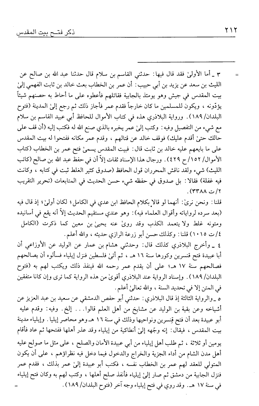 = ٣ - أما الأولى فقد قال فيها: حدثني القاسم بن سلام قال حدثنا عبد الله بن صالح عن الليث بن سعد عن يزيد بن أبي حبيب: أن عمر بن الخطاب بعث خالد بن ثابت الفهمي إلى بيت المقدس في جيش وهو يومئذ بالجابية فقاتلهم فأعطوه على ما أحاط به حصنهم شيئًا يؤذونه، ويكون للمسلمين ما كان خارجًا فقدم عمر فأجاز ذلك ثم رجع إلى المدينة (فتوح البلدان / ١٨٩). ورواية البلاذري هذه في كتاب الأموال للحافظ أبي عبيد القاسم بن سلام مع شيء من التفصيل وفيه: وكتب إلى عمر يخبره بالذي صنع الله له فكتب إليه (أن قف على حالك حتى أقدم عليك) فوقف خالد عن قتالهم، وقدم عمر مكانه ففتحوا له بيت المقدس على ما بايعهم عليه خالد بن ثابت قال: فبيت المقدس يسمى فتح عمر بن الخطاب (كتاب الأموال / ١٥٢ / ح ٤٢٩). ورجال هذا الإسناد ثقات إلَّا أن في حفظ عبد الله بن صالح (كاتب الليث) شيء ولقد ناقش المحرران قول الحافظ (صدوق كثير الغلط ثبت في كتابه، وكانت فيه غفلة) فقالا: بل صدوق في حفظه شيء حسن الحديث في المتابعات (تحرير التقريب ٢ / ت ٣٣٨٨).