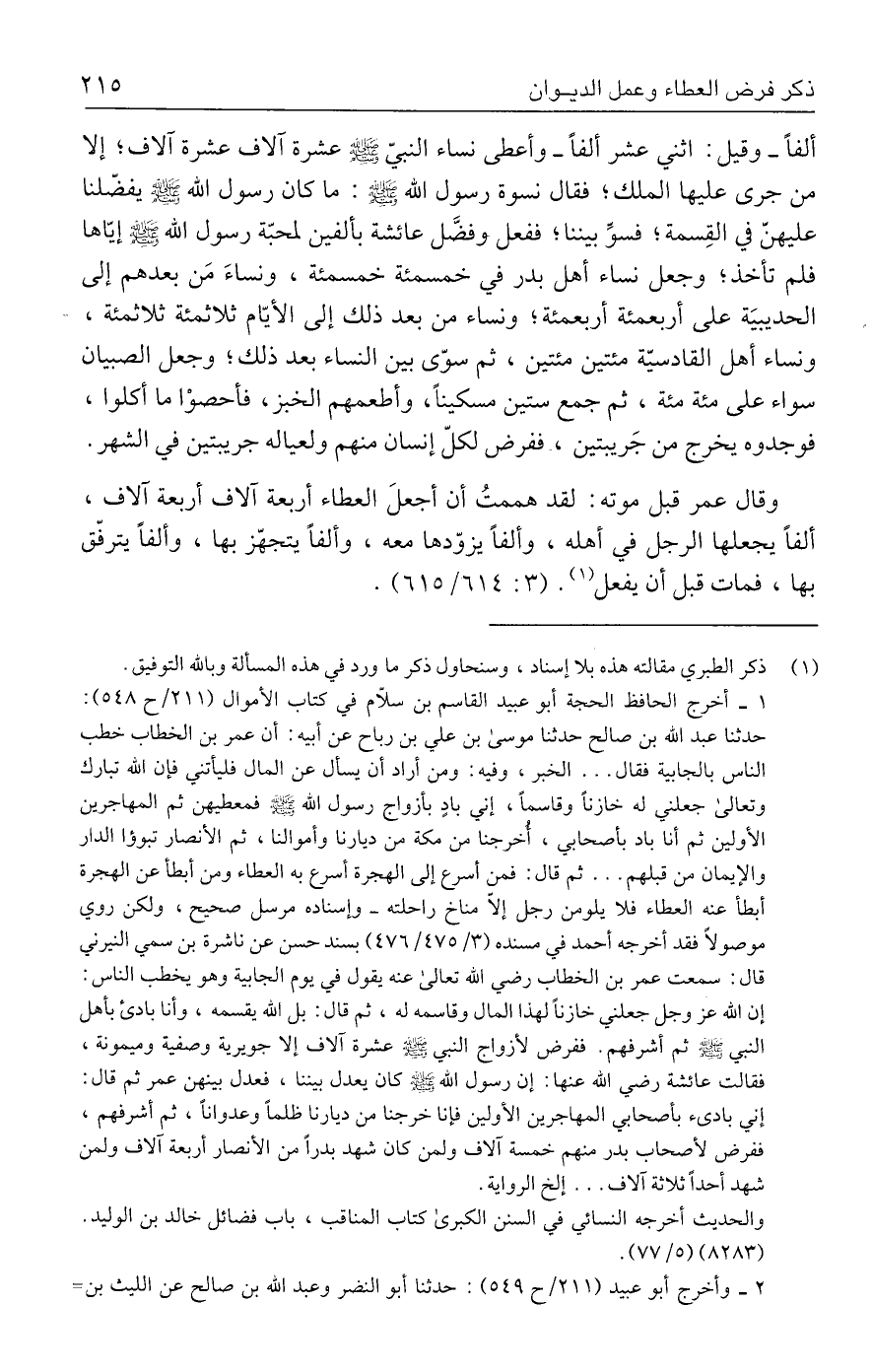 ١ - أخرج الحافظ الحجة أبو عبيد القاسم بن سلّام في كتاب الأموال (٢١١ / ح ٥٤٨): حدثنا عبد الله بن صالح حدثنا موسى بن علي بن رباح عن أبيه: أن عمر بن الخطاب خطب الناس بالجابية فقال ... الخبر، وفيه: ومن أراد أن يسأل عن المال فليأتني فإن الله تبارك وتعالى جعلني له خازنًا وقاسمًا، إني بادٍ بأزواج رسول الله - صلى الله عليه وسلم - فمعطيهن ثم المهاجرين الأولين ثم أنا باد بأصحابي، أُخرجنا من مكة من ديارنا وأموالنا، ثم الأنصار تبوؤا الدار والإيمان من قبلهم ... ثم قال: فمن أسرع إلى الهجرة أسرع به العطاء ومن أبطأ عن الهجرة أبطأ عنه العطاء فلا يلومن رجل إلَّا مناخ راحلته - وإسناده مرسل صحيح، ولكن روي موصولًا فقد أخرجه أحمد في مسنده (٣/ ٤٧٥ / ٤٧٦) بسند حسن عن ناشرة بن سمي النيرني قال: سمعت عمر بن الخطاب رضي الله تعالى عنه يقول في يوم الجابية وهو يخطب الناس: إن الله عزَّ وجلَّ جعلني خازنًا لهذا المال وقاسمه له، ثم قال: بل الله يقسمه، وأنا بادئ بأهل النبي - صلى الله عليه وسلم - ثم أشرفهم. ففرض لأزواج النبي - صلى الله عليه وسلم - عشرة آلاف إلَّا جويرية وصفية وميمونة، فقالت عائشة رضي الله عنها: إن رسول الله - صلى الله عليه وسلم - كان يعدل بيننا، فعدل بينهن عمر ثم قال: إني بادئ بأصحابي المهاجرين الأولين فإنا خرجنا من ديارنا ظلمًا وعدوانًا، ثم أشرفهم، ففرض لأصحاب بدر منهم خمسة آلاف ولمن كان شهد بدرًا من الأنصار أربعة آلاف ولمن شهد أحدًا ثلاثة آلاف ... إلخ الرواية.