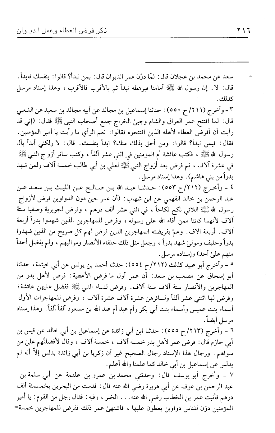 ٣ - وأخرج (٢١١ / ح ٥٥٠): حدثنا إسماعيل بن مجالد عن أبيه مجالد بن سعيد عن الشعبي قال: لما افتتح عمر العراق والشام وجبى الخراج جمع أصحاب النبي - صلى الله عليه وسلم - فقال: (إني قد رأيت أن أفرض العطاء لأهله الذين افتتحوه فقالوا: نعم الرأي ما رأيت يا أمير المؤمنين. فقال: فيمن نبدأ؟ قالوا: ومن أحق بذلك منك؟ ابدأ بنفسك. قال: لا ولكني أبدأ بآل رسول الله - صلى الله عليه وسلم -، فكتب عائشة أم المؤمنين في اثني عشر ألفًا، وكتب سائر أزواج النبي - صلى الله عليه وسلم - في عشرة آلاف، ثم فرض بعد أزواج النبي - صلى الله عليه وسلم - لعلي بن أبي طالب خمسة آلاف ولمن شهد بدرًا من بني هاشم). وهذا إسناد مرسل.