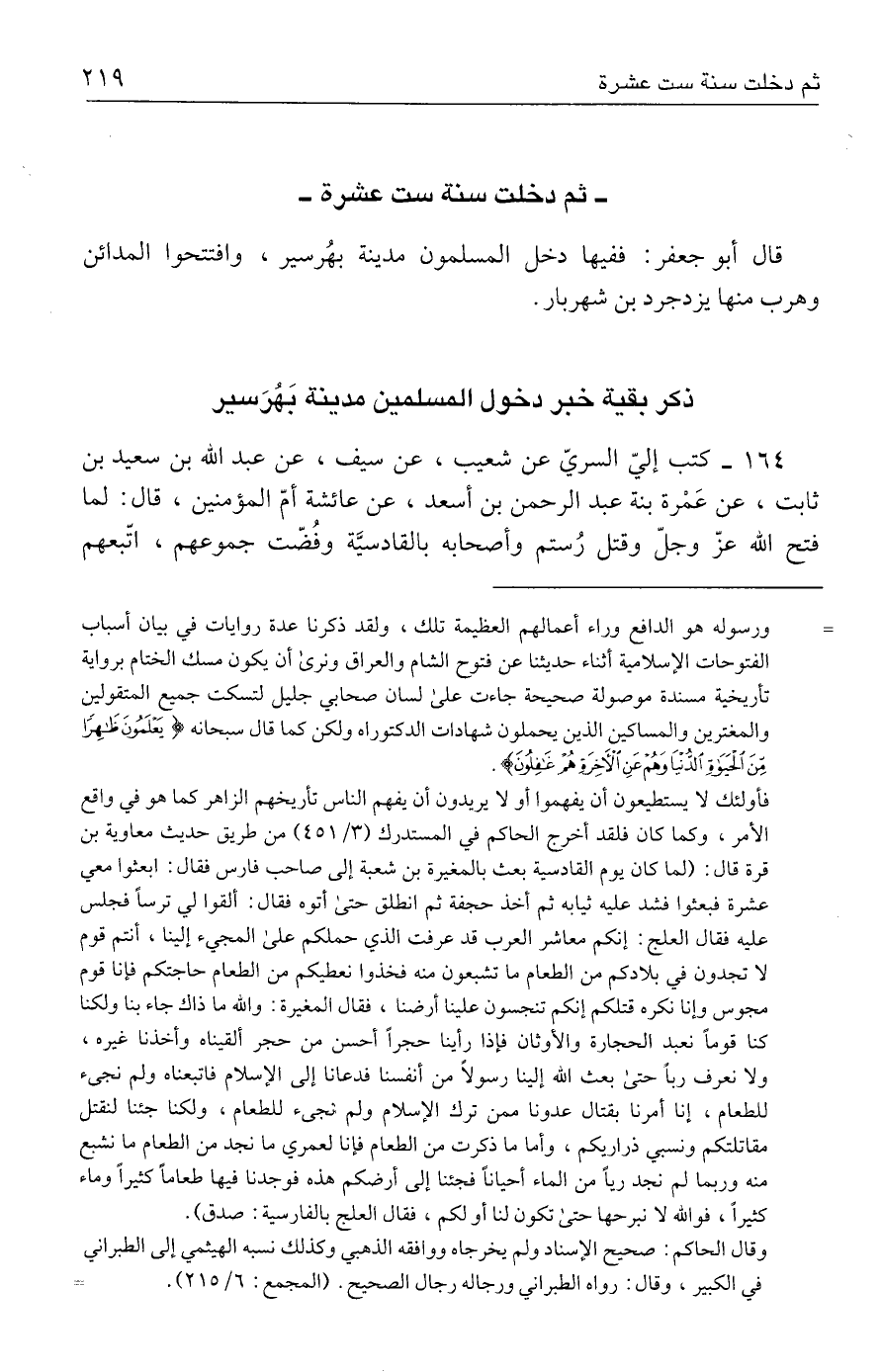 ١٦٤ - كتب إليّ السريّ عن شعيب، عن سيف، عن عبد الله بن سعيد بن ثابت، عن عَمْرة بنة عبد الرحمن بن أسعد، عن عائشة أمّ المؤمنين، قال: لما فتح الله عزّ وجلّ وقتل رُستم وأصحابه بالقادسيَّة وفُضّت جموعهم، اتّبعهم