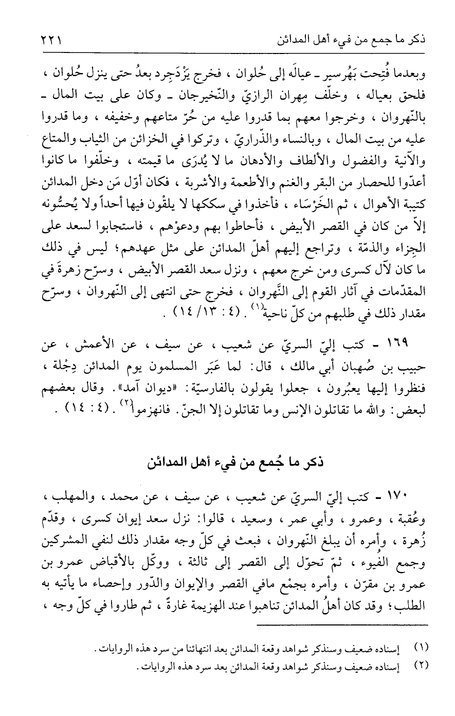 ١٧٠ - كتب إليّ السريّ عن شعيب، عن سيف، عن محمد، والمهلب، وعُقبة، وعمرو، وأبي عمر، وسعيد، قالوا: نزل سعد إيوان كسرى، وقدّم زُهرة، وأمره أن يبلغ النّهروان، فبعث في كلّ وجه مقدار ذلك لنفي المشركين وجمع الفُيوء، ثمّ تحوّل إلى القصر إلى ثالثة، ووكّل بالأقباض عمرو بن عمرو بن مقرّن، وأمره بجمْع ما في القصر والإيوان والدّور وإحصاء ما يأتيه به الطلب؛ وقد كان أهلُ المدائن تناهبوا عند الهزيمة غارةً، ثم طاروا في كلّ وجه،