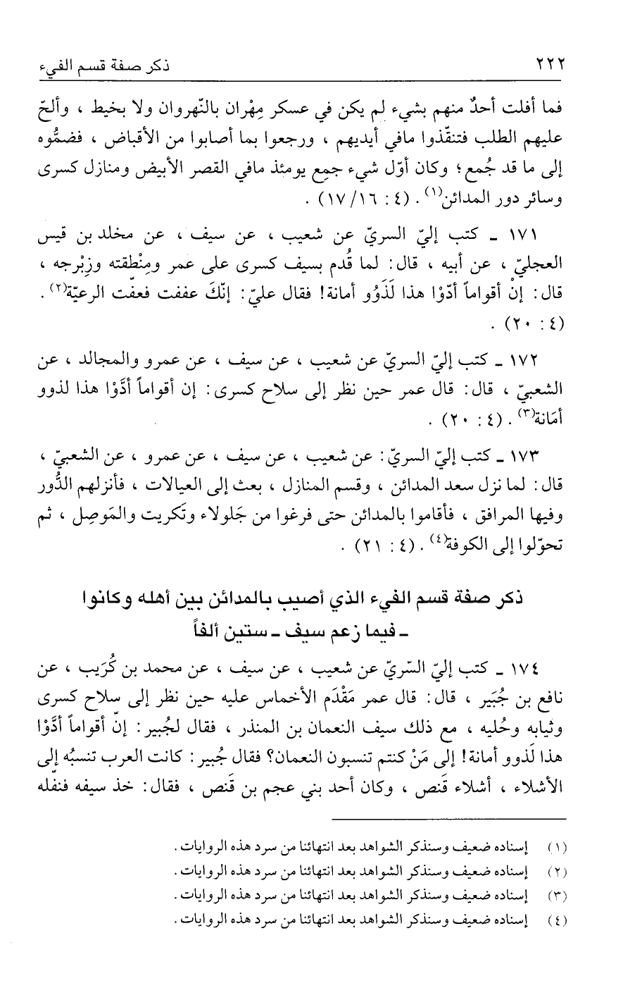١٧٢ - كتب إليّ السريّ عن شعيب، عن سيف، عن عمرو والمجالد، عن الشعبيّ، قال: قال عمر حين نظر إلى سلاح كسرى: إن أقوامًا أدَّوْا هذا لذوو أمَانة (٣). (٤: ٢٠).