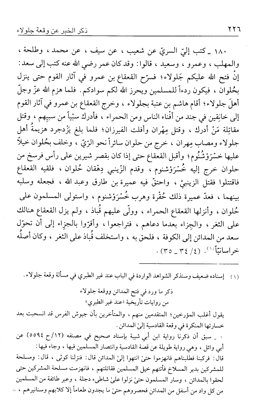 ١٨٠ - كتب إليّ السريّ عن شعيب، عن سيف، عن محمد، وطلحة، والمهلب، وعمرو، وسعيد، قالوا: وقد كان عمر رضي الله عنه كتب إلى سعد: إنْ فتح الله عليكم جَلولاء، فسرّح القعقاع بن عمرو في آثار القوم حتى ينزل بحُلوان، فيكون ردءًا للمسلمين ويحرز الله لكم سوادكم. فلما هزم الله عزّ وجلّ أهلَ جلولاء؛ أقام هاشم بن عتبة بجلولاء، وخرج القعقاع بن عمرو في آثار القوم إلى خانِقين في جند من أفْناء الناس ومن الحمراء، فأدرك سبْيًا من سبيِهم، وقتل مقاتِلة مَنْ أدرك، وقتل مِهْران وأفلت الفيرزان؛ فلما بلغ يَزْدجرد هزيمةُ أهل جلولاء ومصاب مِهران، خرج من حلوان سائرًا نحو الرّيّ، وخلف بحُلوان خيلًا عليها خسْرَوْشُنُوم، وأقبل القعقاع حتى إذا كان بقصر شيرين على رأس فرسخ من حلوان خرج إليه خُسْرَوْشنوم، وقدم الزّينبي دِهْقان حُلوان، فلقيه القعقاع فاقتتلوا فقتل الزينبيّ، واحتقّ فيه عميرة بن طارق وعبد الله، فجعله وسلبه بينهما، فعدّ عميرة ذلك حُقْرة وهرب خُسْرَوْشنوم، واستولى المسلمون على حُلوان، وأنزلها القعقاع الحمراء، وولّى عليهم قُباذ، ولم يزل القعقاع هنالك على الثغر، والجِزاء بعدما دعاهم، فتراجعوا، وأقرّوا بالجزاء إلى أن تحوّل سعد من المدائن إلى الكوفة، فلحق به، واستخلف قُباذ على الثغر، وكان أصلُه خراسانيًّا (١). (٤/ ٣٤ - ٣٥).