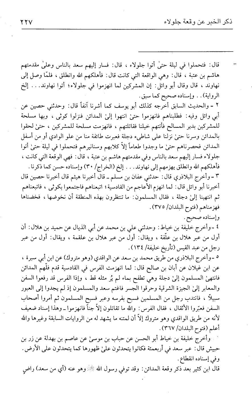 ٢ - والحديث السابق أخرجه كذلك أبو يوسف كما أشرنا آنفًا قال: وحدثني حصين عن أبي وائل وفيه: فطلبناهم فانهزموا حتى انتهوا إلى المدائن فنزلوا كوثى، وبها مسلحة للمشركين بدير المسالح فأتهم خيلنا فقاتلتهم، فانهزمت مسلحة للمشركين، حتى لحقوا بالمدائن وسرنا حتى نزلنا على شاطئ دجلة فعبرت طائفة منا من علو الوادي أو من أسفل المدائن فحصرناهم حتى ما وجدوا طعامًا إلَّا كلابهم وسنانيرهم فتحملوا في ليلة حتى أتوا جلولاء فسار إليهم سعد بالناس وفي مقدمتهم هاشم بن عتبة، قال: فهي الوقعة التي كانت، فأهلكهم الله وانطلق يهزمهم إلى نهاوند ... إلخ (الخراج / ٣٠) وإسناده حسن كما ذكرنا.