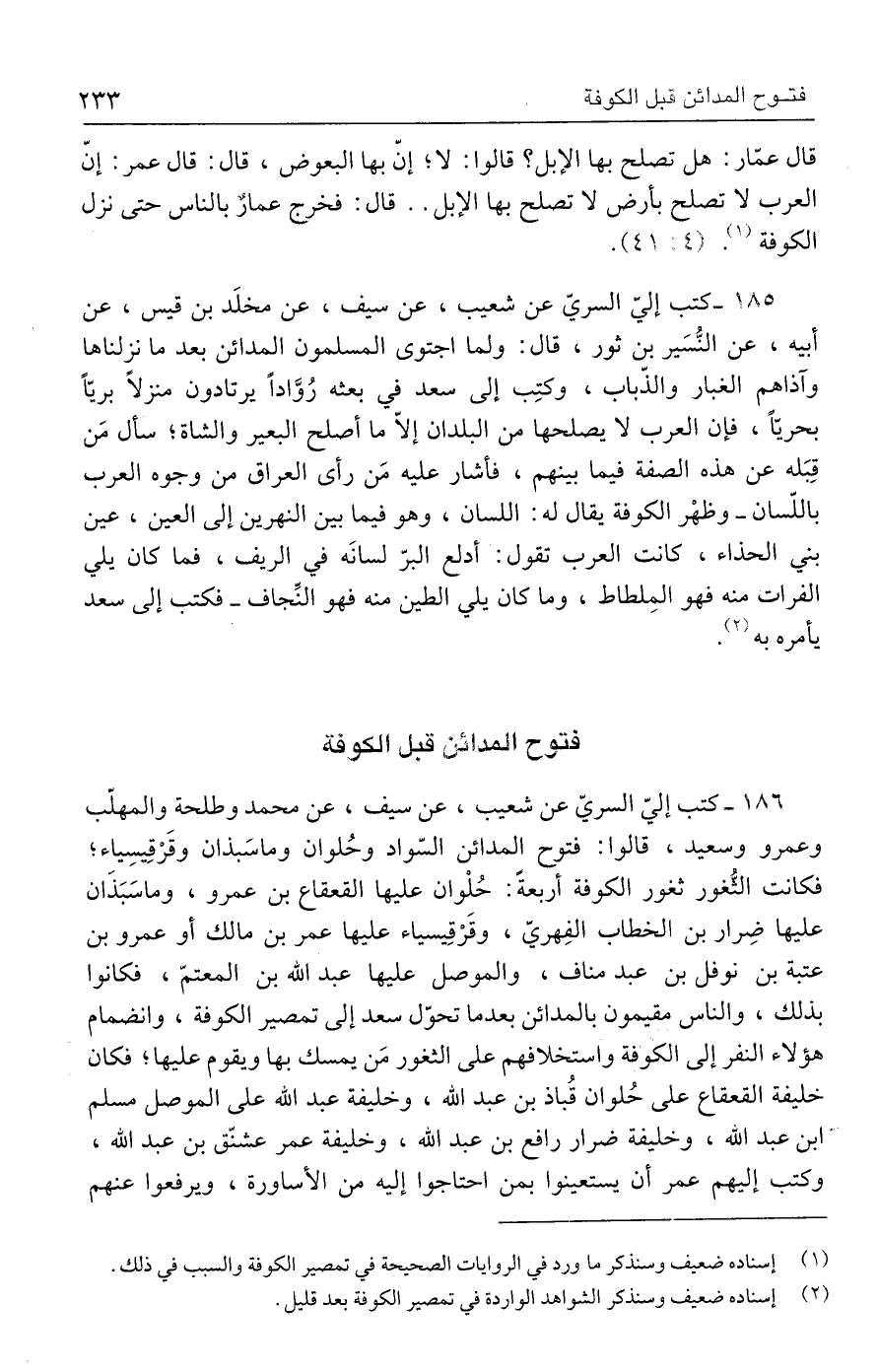 (٢) إسناده ضعيف وسنذكر الشواهد الواردة في تمصير الكوفة بعد قليل.