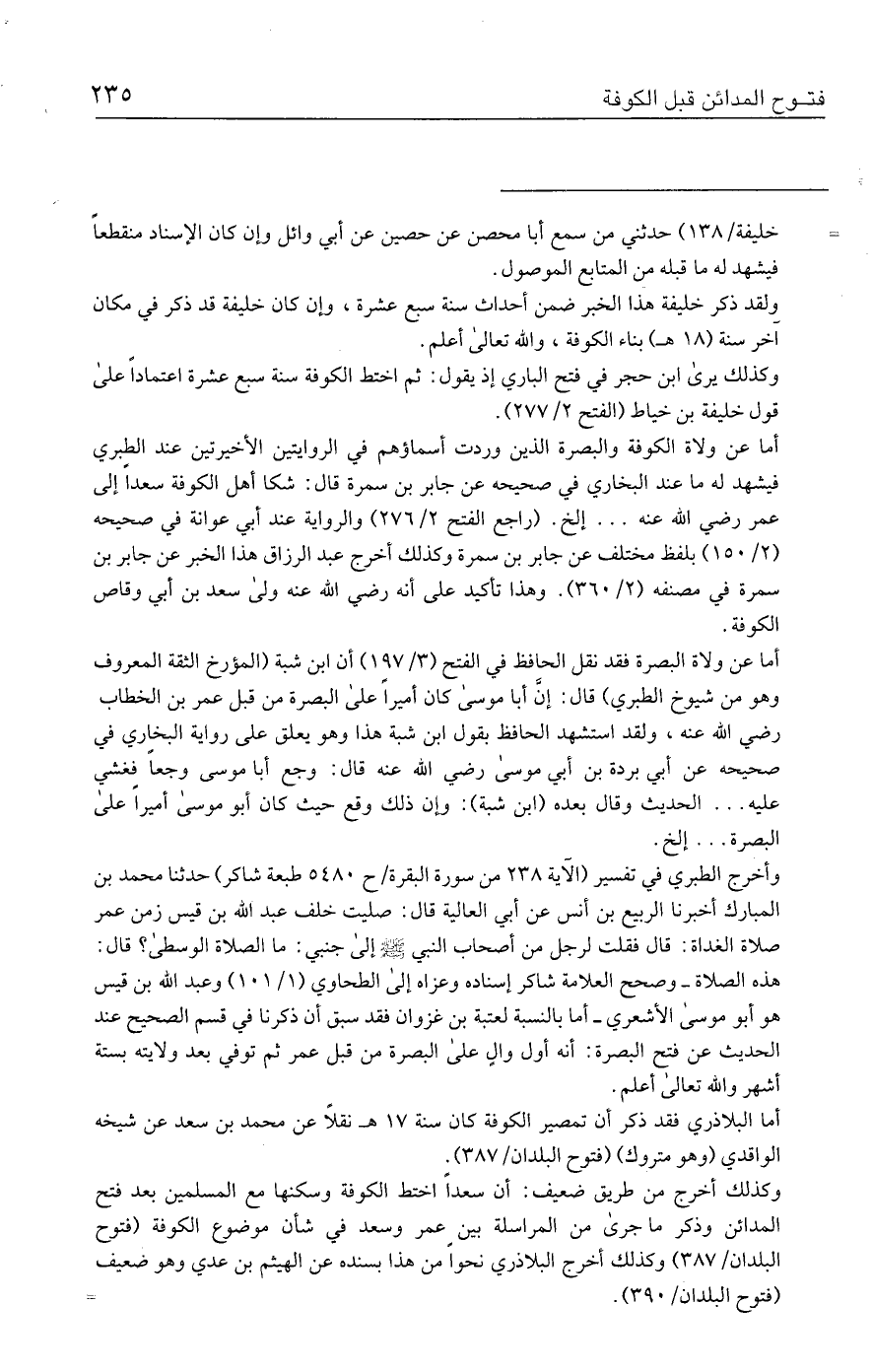 وكذلك أخرج من طريق ضعيف: أن سعدًا اختط الكوفة وسكنها مع المسلمين بعد فتح المدائن وذكر ما جرى من المراسلة بين عمر وسعد في شأن موضوع الكوفة (فتوح البلدان / ٣٨٧) وكذلك أخرج البلاذري نحوًا من هذا بسنده عن الهيثم بن عدي وهو ضعيف (فتوح البلدان / ٣٩٠). =