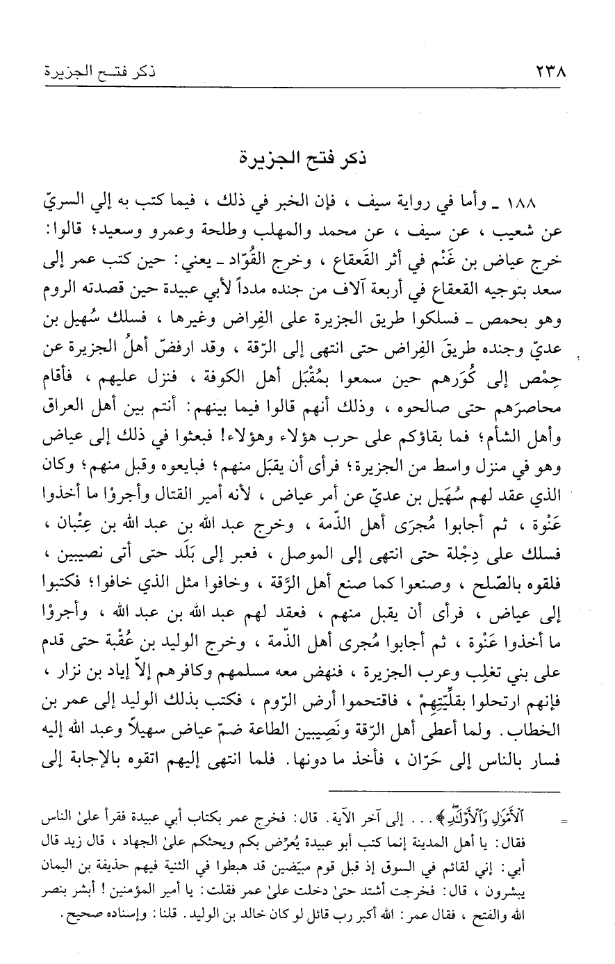 ١٨٨ - وأما في رواية سيف، فإن الخبر في ذلك، فيما كتب به إلي السريّ عن شعيب، عن سيف، عن محمد والمهلب وطلحة وعمرو وسعيد؛ قالوا: خرج عياض بن غَنْم في أثر القَعقاع، وخرج القُوّاد -يعني: حين كتب عمر إلى سعد بتوجيه القعقاع في أربعة آلاف من جنده مددًا لأبي عبيدة حين قصدته الروم وهو بحمص- فسلكوا طريق الجزيرة على الفِراض وغيرها، فسلك سُهيل بن عديّ وجنده طريقَ الفِراض حتى انتهى إلى الرّقة، وقد ارفضّ أهلُ الجزيرة عن حِمْص إلى كُوَرهم حين سمعوا بمُقْبَل أهل الكوفة، فنزل عليهم، فأقام محاصرَهم حتى صالحوه، وذلك أنهم قالوا فيما بينهم: أنتم بين أهل العراق وأهل الشأم؛ فما بقاؤكم على حرب هؤلاء وهؤلاء! فبعثوا في ذلك إلى عياض وهو في منزل واسط من الجزيرة؛ فرأى أن يقبَل منهم؟ فبايعوه وقبل منهم؛ وكان الذي عقد لهم سُهَيل بن عديّ عن أمر عياض، لأنه أمير القتال وأجروْا ما أخذوا عَنْوة، ثم أجابوا مُجرَى أهل الذّمة، وخرج عبد الله بن عبد الله بن عِتْبان، فسلك على دِجْلة حتى انتهى إلى الموصل، فعبر إلى بَلَد حتى أتى نصيبين، فلقوه بالصّلح، وصنعوا كما صنع أهل الرَّقة، وخافوا مثل الذي خافوا؛ فكتبوا إلى عياض، فرأى أن يقبل منهم، فعقد لهم عبد الله بن عبد الله، وأجروْا ما أخذوا عَنْوة، ثم أجابوا مُجرى أهل الذّمة، وخرج الوليد بن عُقْبة حتى قدم على بني تغلِب وعرب الجزيرة، فنهض معه مسلمهم وكافرهم إلَّا إياد بن نزار، فإنهم ارتحلوا بقلِّيّتِهِمْ، فاقتحموا أرض الرّوم، فكتب بذلك الوليد إلى عمر بن الخطاب. ولما أعطى أهل الرّقة ونَصِيبين الطاعة ضمّ عياض سهيلًا وعبد الله إليه فسار بالناس إلى حَرّان، فأخذ ما دونها. فلما انتهى إليهم اتقوه بالإجابة إلى