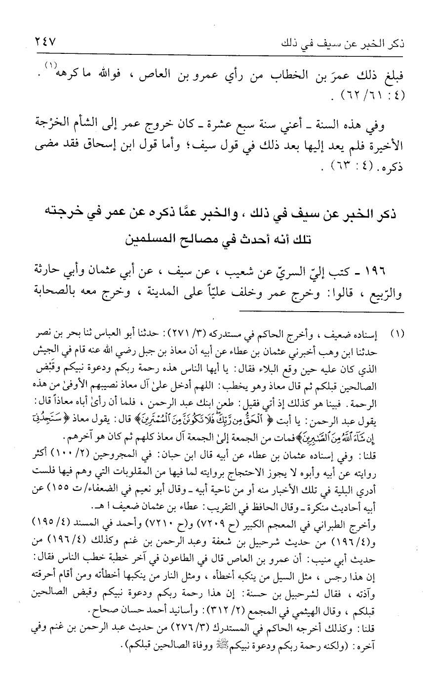 ١٩٦ - كتب إليّ السريّ عن شعيب، عن سيف، عن أبي عثمان وأبي حارثة والرّبيع، قالوا: وخرج عمر وخلف عليًّا على المدينة، وخرج معه بالصحابة