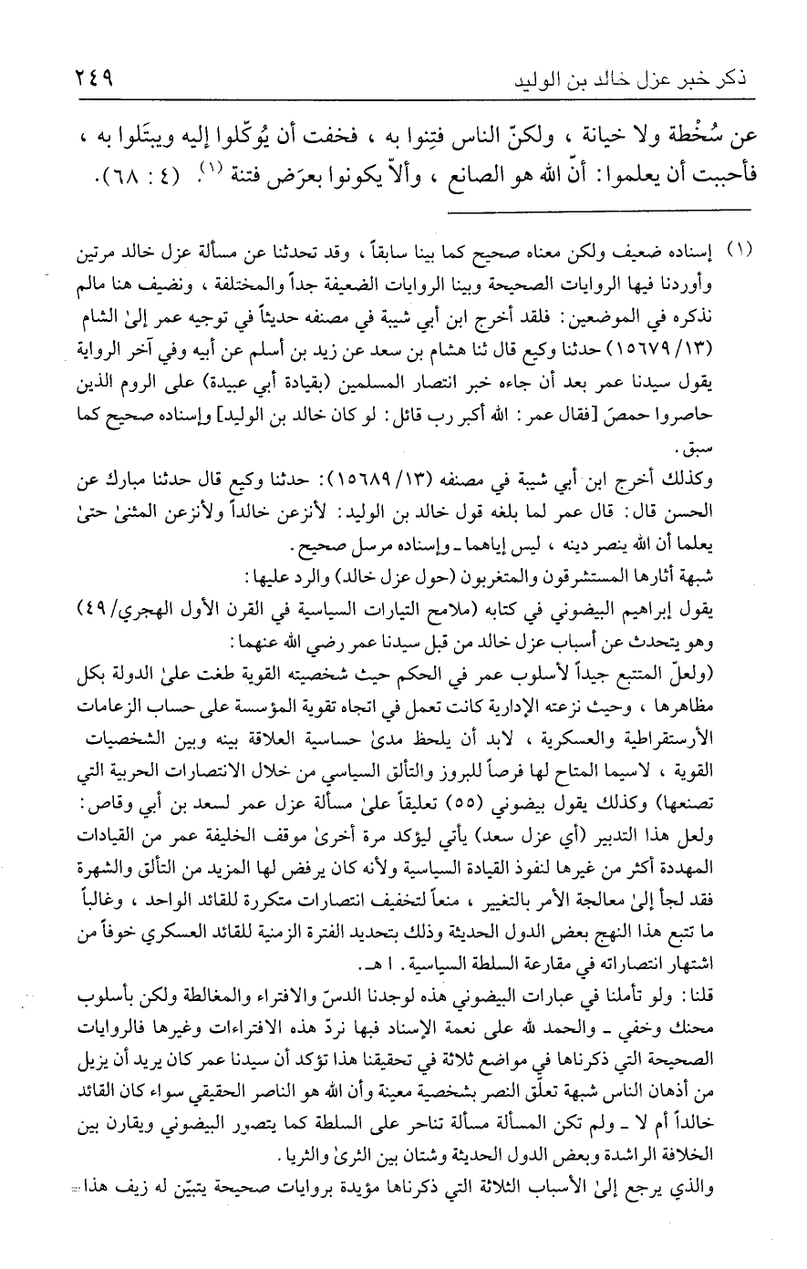 قلنا: ولو تأملنا في عبارات البيضوني هذه لوجدنا الدسَّ والافتراء والمغالطة ولكن بأسلوب محنك وخفي - والحمد لله على نعمة الإسناد فيها نردّ هذه الافتراءات وغيرها فالروايات الصحيحة التي ذكرناها في مواضع ثلاثة في تحقيقنا هذا تؤكد أن سيدنا عمر كان يريد أن يزيل من أذهان الناس شبهة تعلّق النصر بشخصية معينة وأن الله هو الناصر الحقيقي سواء كان الفائد خالدًا أم لا - ولم تكن المسألة مسألة تناحر على السلطة كما يتصور البيضوني ويقارن بين الخلافة الراشدة وبعض الدول الحديثة وشتان بين الثرى والثريا.