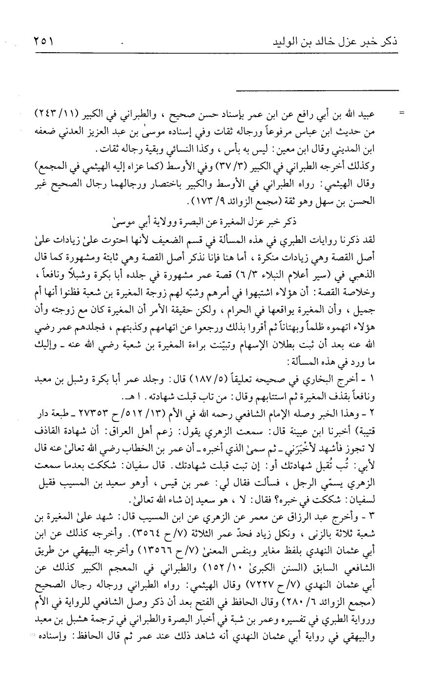 لقد ذكرنا روايات الطبري في هذه المسألة في قسم الضعيف لأنها احتوت على زيادات على أصل القصة وهي زيادات منكرة، أما هنا فإنا نذكر أصل القصة وهي ثابتة ومشهورة كما قال الذهبي في (سير أعلام النبلاء ٣/ ٦) قصة عمر مشهورة في جلده أبا بكرة وشبلًا ونافعًا، وخلاصة القصة: أن هؤلاء اشتبهوا في أمرهم وشبّه لهم زوجة المغيرة بن شعبة فظنوا أنها أم جميل، وأن المغيرة يواقعها في الحرام، ولكن حقيقة الأمر أن المغيرة كان مع زوجته وأن هؤلاء اتهموه ظلمًا وبهتانًا ثم أقروا بذلك ورجعوا عن اتهامهم وكذبتهم، فجلدهم عمر رضي الله عنه بعد أن ثبت بطلان الإسهام وتبيّنت براءة المغيرة بن شعبة رضي الله عنه - وإليك ما ورد في هذه المسألة: