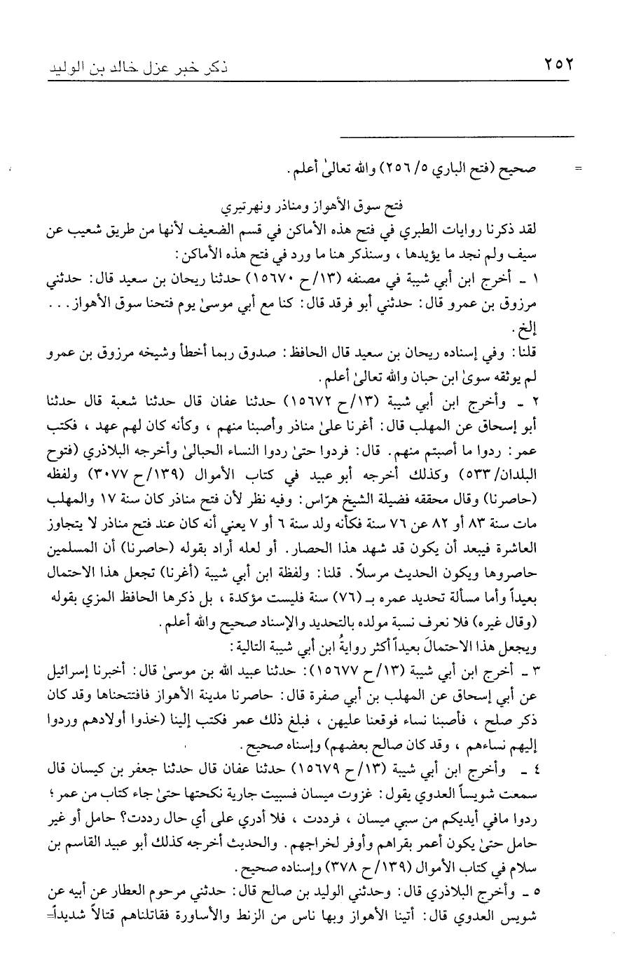 ٢ - وأخرج ابن أبي شيبة (١٣ / ح ١٥٦٧٢) حدثنا عفان قال حدثنا شعبة قال حدثنا أبو إسحاق عن المهلب قال: أغرنا على مناذر وأصبنا منهم، وكأنه كان لهم عهد، فكتب عمر: ردوا ما أصبتم منهم. قال: فردوا حتى ردوا النساء الحبالى وأخرجه البلاذري (فتوح البلدان / ٥٣٣) وكذلك أخرجه أبو عبيد في كتاب الأموال (١٣٩ / ح ٣٠٧٧) ولفظه (حاصرنا) وقال محققه فضيلة الشيخ هرّاس: وفيه نظر لأن فتح مناذر كان سنة ١٧ والمهلب مات سنة ٨٣ أو ٨٢ عن ٧٦ سنة فكأته ولد سنة ٦ أو ٧ يعني أنه كان عند فتح مناذر لا يتجاوز العاشرة فيبعد أن يكون قد شهد هذا الحصار. أو لعله أراد بقوله (حاصرنا) أن المسلمين حاصروها ويكون الحديث مرسلًا. قلنا: ولفظة ابن أبي شيبة (أغرنا) تجعل هذا الاحتمال بعيدًا وأما مسألة تحديد عمره بـ (٧٦) سنة فليست مؤكدة، بل ذكرها الحافظ المزي بقوله (وقال غيره) فلا نعرف نسبة مولده بالتحديد والإسناد صحيح والله أعلم.