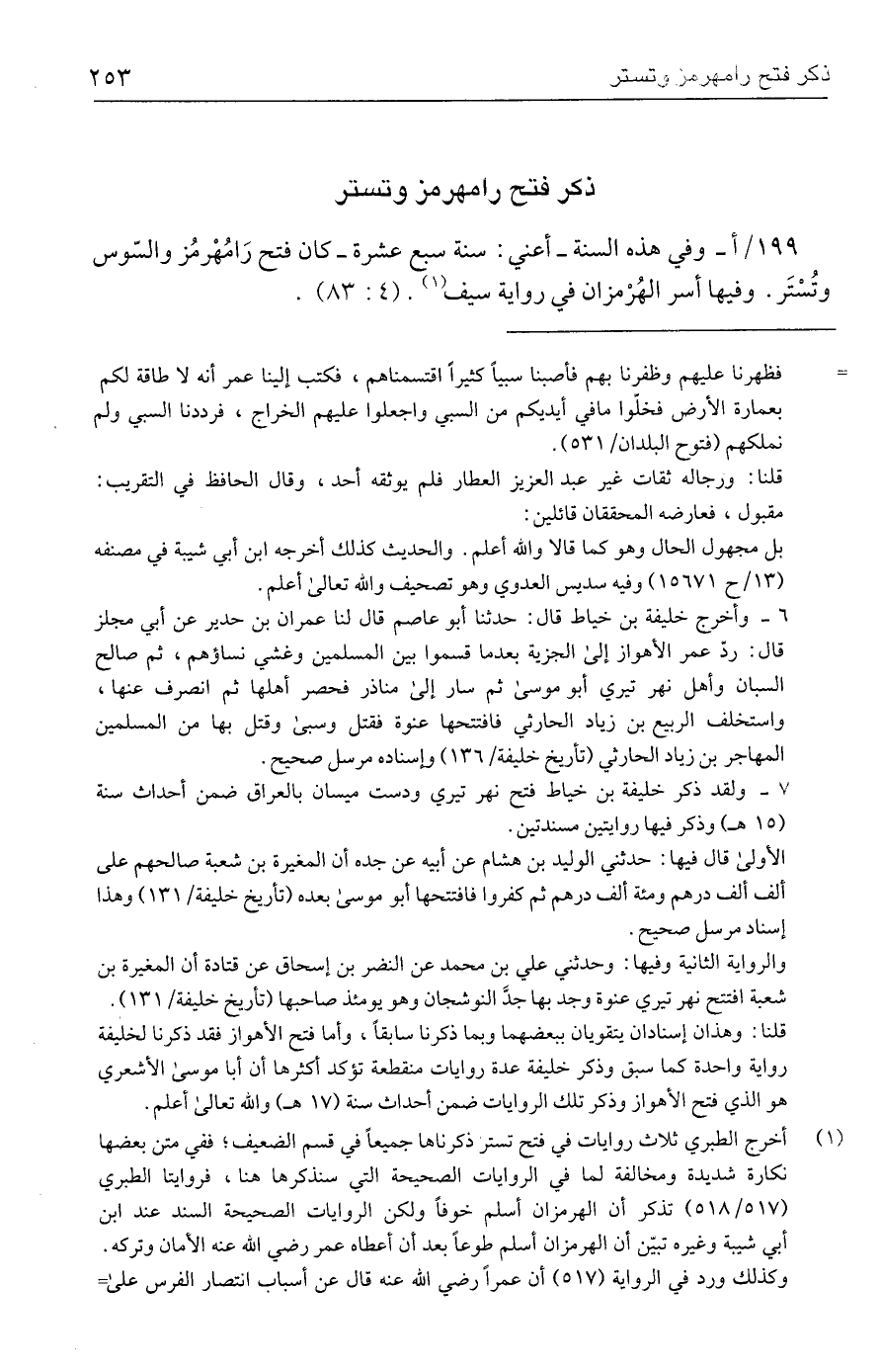 (١) أخرج الطبري ثلاث روايات في فتح تستر ذكرناها جميعًا في قسم الضعيف؟ ففي متن بعضها نكارة شديدة ومخالفة لما في الروايات الصحيحة التي سنذكرها هنا، فروايتا الطبري (٥١٧/ ٥١٨) تذكر أن الهرمزان أسلم خوفًا ولكن الروايات الصحيحة السند عند ابن أبي شيبة وغيره تبيّن أن الهرمزان أسلم طوعًا بعد أن أعطاه عمر رضي الله عنه الأمان وتركه. وكذلك ورد في الرواية (٥١٧) أن عمرًا رضي الله عنه قال عن أسباب انتصار الفرس على =