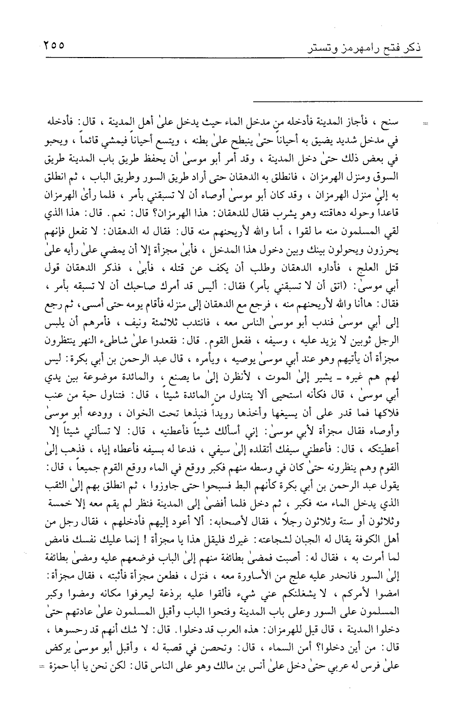 = سنح، فأجاز المدينة فأدخله من مدخل الماء حيث يدخل على أهل المدينة، قال: فأدخله في مدخل شديد يضيق به أحيانا حتى ينبطح على بطنه، ويتسع أحيانًا فيمشي قائمًا، ويحبو في بعض ذلك حتى دخل المدينة، وقد أمر أبو موسى أن يحفظ طريق باب المدينة طريق السوق ومنزل الهرمزان، فانطلق به الدهقان حتى أراد طريق السور وطريق الباب، ثم انطلق به إلى منزل الهرمزان، وقد كان أبو موسى أوصاه أن لا تسبقني بأمر، فلما رأى الهرمزان قاعدًا وحوله دهاقنته وهو يشرب فقال للدهقان: هذا الهرمزان؟ قال: نعم. قال: هذا الذي لقي المسلمون منه ما لقوا، أما والله لأريحنهم منه قال: فقال له الدهقان: لا تفعل فإنهم يحرزون ويحولون بينك وبين دخول هذا المدخل، فأبى مجزأة إلَّا أن يمضي على رأيه على قتل العلج، فأداره الدهقان وطلب أن يكف عن قتله، فأبى، فذكر الدهقان قول أبي موسى: (اتق أن لا تسبقني بأمر) فقال: أليس قد أمرك صاحبك أن لا تسبقه بأمر، فقال: ها أنا والله لأريحنهم منه، فرجع مع الدهقان إلى منزله فأقام يومه حتى أمسى، ثم رجع إلى أبي موسى فندب أبو موسى الناس معه، فانتدب ثلاثمئة ونيف، فأمرهم أن يلبس الرجل ثوبين لا يزيد عليه، وسيفه، ففعل القوم. قال: فقعدوا على شاطئ النهر ينتظرون مجزأة أن يأتيهم وهو عند أبي موسى يوصيه، ويأمره، قال عبد الرحمن بن أبي بكرة: ليس لهم هم غيره - يشير إلى الموت، لأنظرن إلى ما يصنع، والمائدة موضوعة بين يدي أبي موسى، قال فكأنه استحيى ألا يتناول من المائدة شيئًا، قال: فتناول حبة من عنب فلاكها فما قدر على أن يسيغها وأخذها رويدًا فنبذها تحت الخوان، وودعه أبو موسى وأوصاه فقال مجزأة لأبي موسى: إني أسألك شيئًا فأعطنيه، قال: لا تسألني شيئًا إلَّا أعطيتكه، قال: فأعطني سيفك أتقلده إلى سيفي، فدعا له بسيفه فأعطاه إياه، فذهب إلى القوم وهم ينظرونه حتى كان في وسطه منهم فكبر ووقع في الماء ووقع القوم جميعًا، قال: يقول عبد الرحمن بن أبي بكرة كأنهم البط فسبحوا حتى جاوزوا، ثم انطلق بهم إلى الثقب الذي يدخل الماء منه فكبر، ثم دخل فلما أفضى إلى المدينة فنظر لم يقم معه إلَّا خمسة وثلاثون أو ستة وثلاثون رجلًا، فقال لأصحابه: ألا أعود إليهم فأدخلهم، فقال رجل من أهل الكوفة يقال له الجبان لشجاعته: غيرك فليقل هذا يا مجزأة! إنما عليك نفسك فامض لما أمرت به، فقال له: أصبت فمضى بطائفة منهم إلى الباب فوضعهم عليه ومضى بطائفة إلى السور فانحدر عليه علج من الأساورة معه، فنزل، فطعن مجزأة فأثبته، فقال مجزأة: امضوا لأمركم، لا يشغلنكم عني شيء فألقوا عليه برذعة ليعرفوا مكانه ومضوا وكبر المسلمون على السور وعلى باب المدينة وفتحوا الباب وأقبل المسلمون على عادتهم حتى دخلوا المدينة، قال قيل للهرمزان: هذه العرب قد دخلوا. قال: لا شك أنهم قد رحسوها، قال: من أين دخلوا؟ أمن السماء، قال: وتحصن في قصبة له، وأقبل أبو موسى يركض على فرس له عربي حتى دخل على أنس بن مالك وهو على الناس قال: لكن نحن يا أبا حمزة =