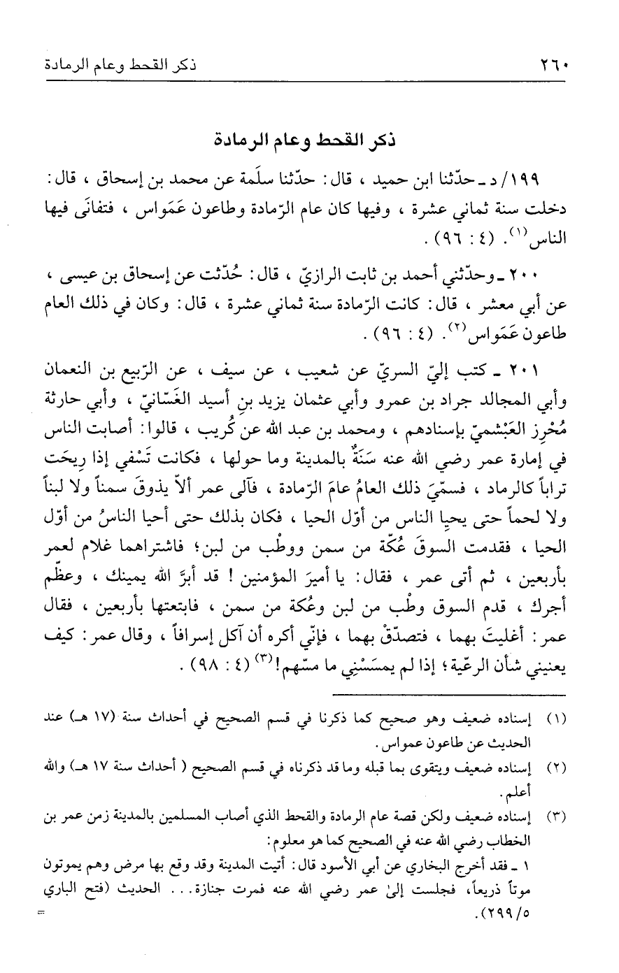 ٢٠٠ - وحدّثني أحمد بن ثابت الرازيّ، قال: حُدّثت عن إسحاق بن عيسى، عن أبي معشر، قال: كانت الرّمادة سنة ثماني عشرة، قال: وكان في ذلك العام طاعون عَمَواس (٢). (٤: ٩٦).