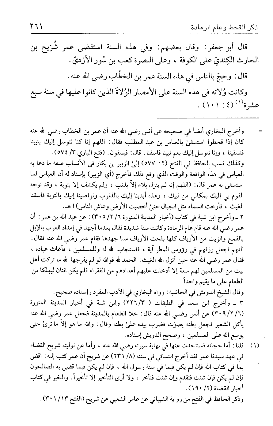 وكذلك نسب الحافظ في الفتح (٢: ٥٧٧) إلى الزبير بن بكار في الأنساب صفة ما دعا به العباس في هذه الواقعة والوقت الذي وقع ذلك فأخرج (أي الزبير) بإسناد له أن العباس لما استسقى به عمر قال: (اللهم إنه لم ينزل بلاء إلّا بذنب، ولم يكشف إلا بتوبة، وقد توجه القوم بي إليك بمكاني من نبيك، وهذه أيدينا إليك بالذنوب ونواصينا إليك بالتوبة فاسقنا الغيث، فأرخت السماء مثل الجبال حتى أخصبت الأرض وعاش الناس) اهـ.