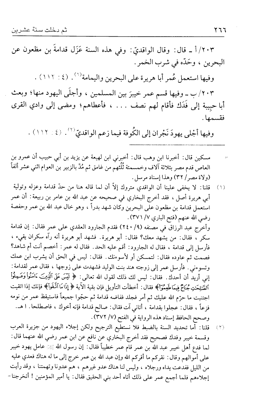 ٢٠٣ / أ- قال: وقال الواقديّ: وفي هذه السنة عَزَل قدامةَ بن مظعون عن البحرين، وحَدّه في شرب الخمر.