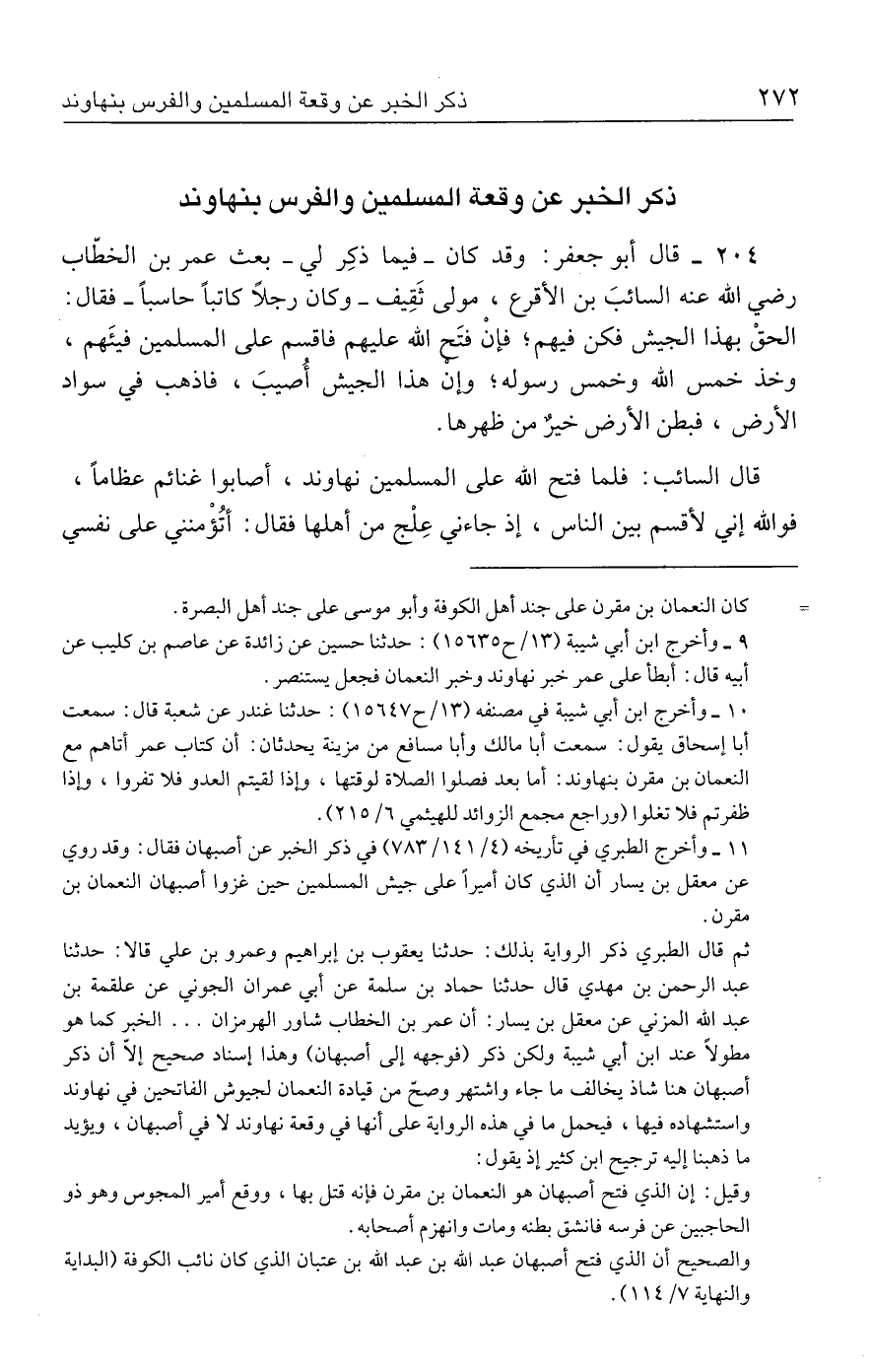 ٢٠٤ - قال أبو جعفر: وقد كان -فيما ذكِر لي- بعث عمر بن الخطّاب - رضي الله عنه - السائبَ بن الأقرع، مولى ثَقِيف -وكان رجلًا كاتبًا حاسبًا- فقال: الحقْ بهذا الجيش فكن فيهم؛ فإنْ فتَح الله عليهم فاقسم على المسلمين فيئَهم، وخذ خمس الله وخمس رسوله؛ وإن هذا الجيش أُصيبَ، فاذهب في سواد الأرض، فبطن الأرض خيرٌ من ظهرها.
