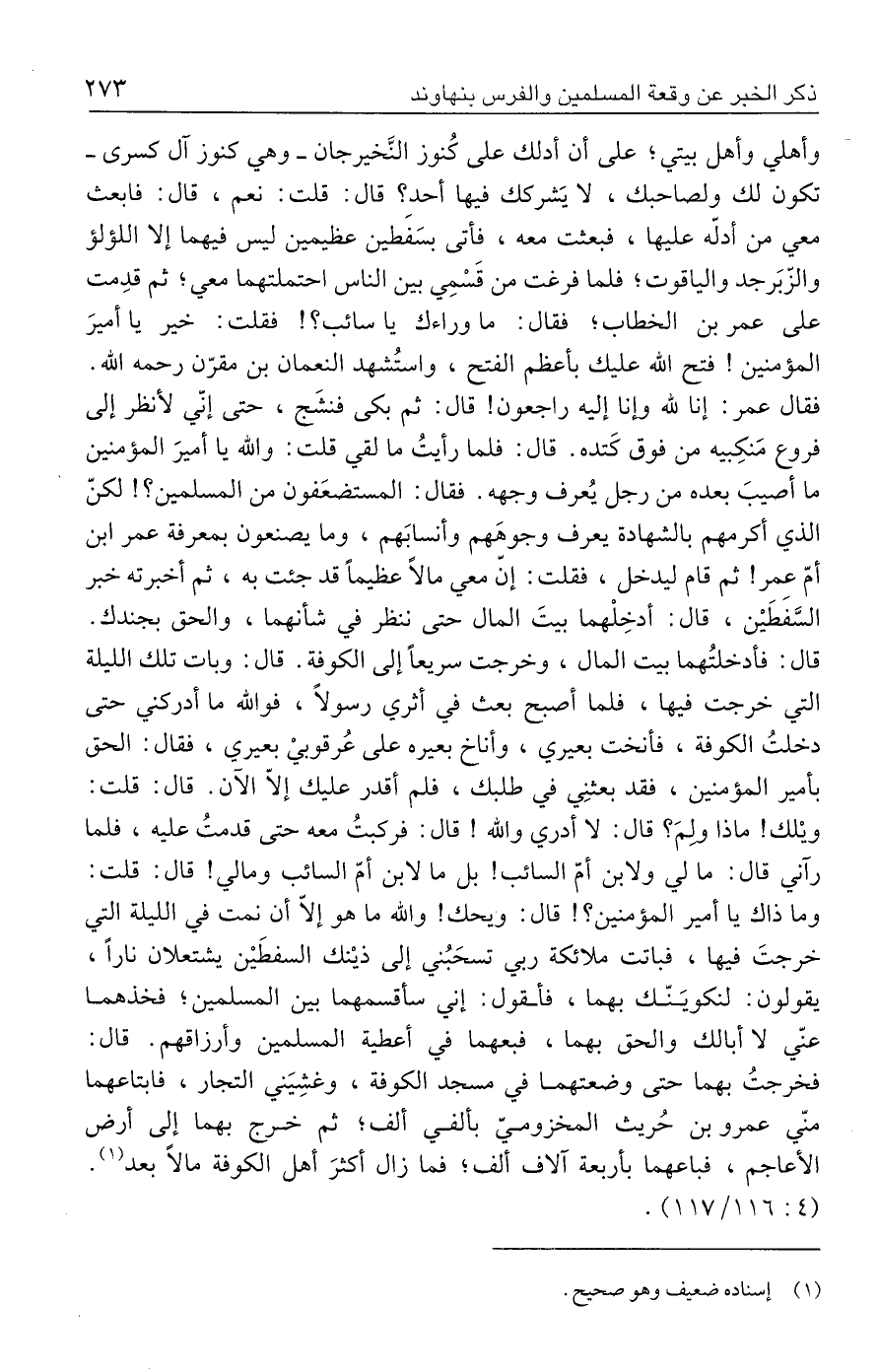 وأهلي وأهل بيتي؛ على أن أدلك على كُنوز النَّخيرجان -وهي كنوز آل كسرى- تكون لك ولصاحبك، لا يَشركك فيها أحد؟ قال: قلت: نعم، قال: فابعث معي من أدلّه عليها، فبعثت معه، فأتى بسَفَطين عظيمين ليس فيهما إلا اللؤلؤ والزّبَرجد والياقوت؛ فلما فرغت من قَسْمِي بين الناس احتملتهما معي؛ ثم قدِمت على عمر بن الخطاب؛ فقال: ما وراءك يا سائب؟ ! فقلت: خير يا أميرَ المؤمنين! فتح الله عليك بأعظم الفتح، واستُشهد النعمان بن مقرّن رحمه الله. فقال عمر: إنا لله وإنا إليه راجعون! قال: ثم بكى فنشَج، حتى إنّي لأنظر إلى فروع مَنكِبيه من فوق كَتده. قال: فلما رأيتُ ما لقي قلت: والله يا أميرَ المؤمنين ما أصيبَ بعده من رجل يُعرف وجهه. فقال: المستضعَفون من المسلمين؛ ! لكنّ الذي أكرمهم بالشهادة يعرف وجوهَهم وأنسابَهم، وما يصنعون بمعرفة عمر ابن أمّ عمر! ثم قام ليدخل، فقلت: إنّ معي مالًا عظيمًا قد جئت به، ثم أخبرته خبر السَّفَطَين، قال: أدخِلْهما بيتَ المال حتى ننظر في شأنهما، والحق بجندك. قال: فأدخلتُهما بيت المال، وخرجت سريعًا إلى الكوفة. قال: وبات تلك الليلة التي خرجت فيها، فلما أصبح بعث في أثري رسولًا، فوالله ما أدركني حتى دخلتُ الكوفة، فأنخت بعيري، وأناخ بعيره على عُرقوبي بعيري، فقال: الحق بأمير المؤمنين، فقد بعثنِي في طلبك، فلم أقدر عليك إلّا الآن. قال: قلت: ويلك! ماذا ولمَ؟ قال: لا أدري والله! قال: فركبتُ معه حتى قدمتُ عليه، فلما رآني قال: ما لي ولابن أمّ السائب! بل ما لابن أمّ السائب وما لي! قال: قلت: وما ذاك يا أمير المؤمنين؛ ! قال: ويحك! والله ما هو إلّا أن نمت في الليلة التي خرجتَ فيها، فباتت ملائكة ربي تسحَبُني إلى ذينك السفطَين يشتعلان نارًا، يقولون: لنكويَنّك بهما، فأقول: إني سأقسمهما بين المسلمين؛ فخذهما عنّي لا أبالك والحق بهما، فبعهما في أعطية المسلمين وأرزاقهم. قال: فخرجتُ بهما حتى وضعتهما في مسجد الكوفة، وغشِيَني التجار، فابتاعهما منّي عمرو بن حُريث المخزوميّ بألفي ألف؛ ثم خرج بهما إلى أرض الأعاجم، فباعهما بأربعة آلاف ألف؛ فما زال أكثرَ أهل الكوفة مالًا بعد (١). (٤/ ١١٦ / ١١٧).