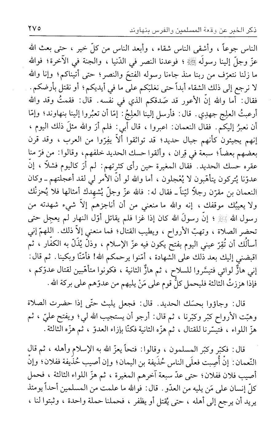 الناس جوعًا، وأشقى الناس شقاء، وأبعد الناس من كلّ خير، حتى بعث الله عزّ وجلّ إلينا رسولَه - صلى الله عليه وسلم -؛ فوعدنا النصر في الدّنيا، والجنة في الآخرة؛ فوالله ما زلنا نتعرّف من ربنا منذ جاءنا رسوله الفتحَ والنصر؛ حتى أتيناكم؛ وإنا والله لا نرجع إلى ذلك الشقاء أبدًا حتى نغلبَكم على ما في أيديكم؛ أو نقتل بأرضكم. فقال: أما والله إنّ الأعور قد صَدقكم الذي في نفسه. قال: فقمتُ وقد والله أرعبتُ العلِج جهدِي. قال: فأرسل إلينا العلِجُ: إمّا أن تعبُروا إلينا بنهاوند؛ وإمّا أن نعبرُ إليكم. فقال النعمان: اعبروا، قال أبي: فلم أرَ والله مثلَ ذلك اليوم، إنهم يجيئون كأنهم جبال حديد؛ قد تواثقوا ألّا يفِرّوا من العرب، وقد قرن بعضهم بعضًا؛ سبعة في قِران، وألقوا حسك الحديد خلفهم، وقالوا: من فرّ منا عقره حسك الحديد. فقال المغيرة حين رأى كثرتهم: لم أرَ كاليوم فشلًا، إنّ عدوّنا يتُركون يتأهّبون لا يُعْجلون، أما والله لو أن الأمر لي لقد أعجلتهم -وكان النعمان بن مقرّن رجلًا ليّنًا- فقال له: فالله عزّ وجلّ يُشهِدك أمثالها فلا يُحزنْك ولا يعيبُك موقفك، إنه والله ما منعني من أن أناجزهم إلّا شيء شهدته من رسول الله - صلى الله عليه وسلم -؛ إنّ رسولَ الله كان إذا غزا فلم يقاتل أوّل النهار لم يعجِل حتى تحضر الصلاة، وتهبّ الأرواح، ويطيب القتال؛ فما منعني إلّا ذلك. اللهمّ إني أسألُك أن تُقِرّ عيني اليوم بفتح يكون فيه عزّ الإسلام، وذلّ يُذَلّ به الكفّار، ثم اقبضني إليك بعد ذلك على الشهادة، أمّنوا يرحمكم الله! فأمّنّا وبكينا. ثم قال: إني هازٌ لوائي فتيسَّروا للسلاح، ثم هازٌّ الثانية، فكونوا متأهّبين لقتال عدوّكم، فإذا هززتُ الثالثة فليحمل كلُّ قوم على مَنْ يليهم من عدوّهم على بركة الله.