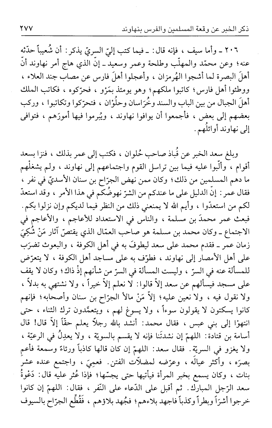 ٢٠٦ - وأما سيف، فإنه قال: -فيما كتب إليّ السريّ يذكر: أن شُعيبًا حدّثه عنه؛ وعن محمّد والمهلّب وطلحة وعمر وسعيد- إنّ الذي هاج أمر نهاوند أنّ أهلَ البصرة لما أشجوا الهُرمزان، وأعجلوا أهلَ فارس عن مصاب جند العلاء، ووطئوا أهل فارس؛ كاتبوا ملكهم؛ وهو يومئذ بمَرْو، فحرّكوه، فكاتب الملك أهلَ الجبال من بين الباب والسند وخُرَاسان وحلُوْان، فتحرّكوا وتكاتبوا، وركب بعضهم إلى بعض، فأجمعوا أن يوافوا نهاوند، ويُبرموا فيها أمورَهم، فتوافى إلى نهاوند أوائلُهم.