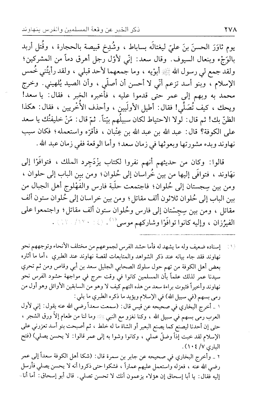 (١) إسناده ضعيف وله ما يشهد له فأما حشد الفرس لجموعهم من مختلف الأنحاء وتوجههم نحو نهاوند فقد جاء بيانه عند ذكر الشواهد والمتابعات لقصة نهاوند عند الطبري، أما ما أثاره بعض أهل الكوفة من تهم حول سلوك الصحابي الجليل سعد بن أبي وقاص ومن ثم تحري سيدنا عمر لذلك علمًا بأن المسلمين كانوا في وقت حرج في مواجهة حشود الفرس نحو نهاوند وأخيرًا فثبوت براءة سعد من هذه التهم كيف لا وهو من السابقين الأوائل وهو أول من رمى بسهم (في سبيل الله) في الإسلام ويؤيد ما ذكره الطبري ما يلي: