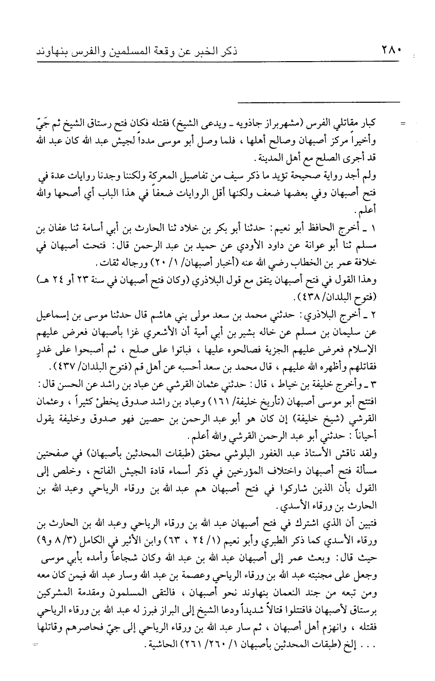 وهذا القول في فتح أصبهان يتفق مع قول البلاذري (وكان فتح أصبهان في سنة ٢٣ أو ٢٤ هـ) (فتوح البلدان / ٤٣٨).