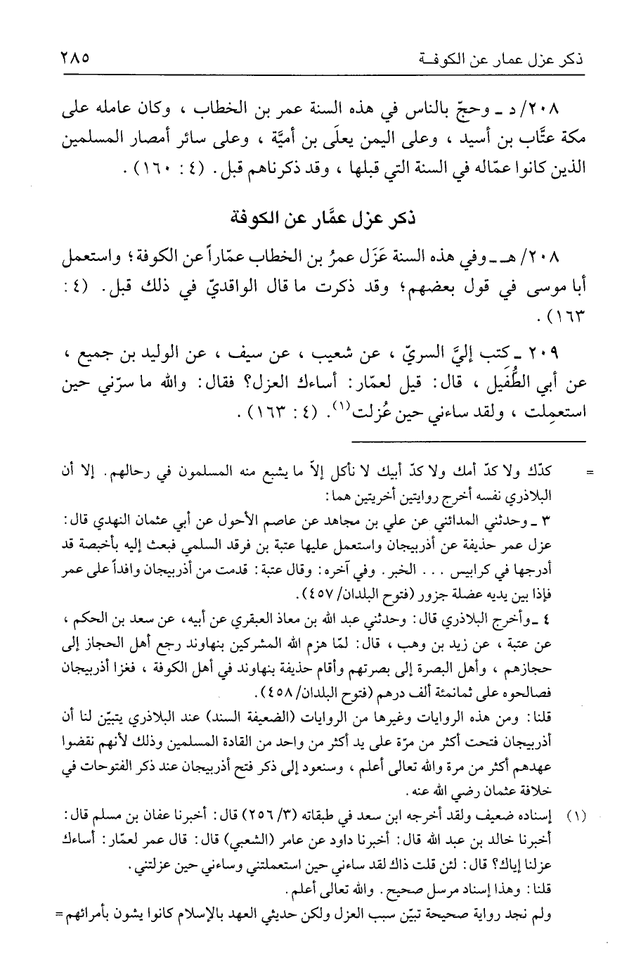 ٢٠٨ / هـ- وفي هذه السنة عَزَل عمرُ بن الخطاب عمّارًا عن الكوفة؛ واستعمل أبا موسى في قول بعضهم؛ وقد ذكرت ما قال الواقديّ في ذلك قبل. (٤: ١٦٣).